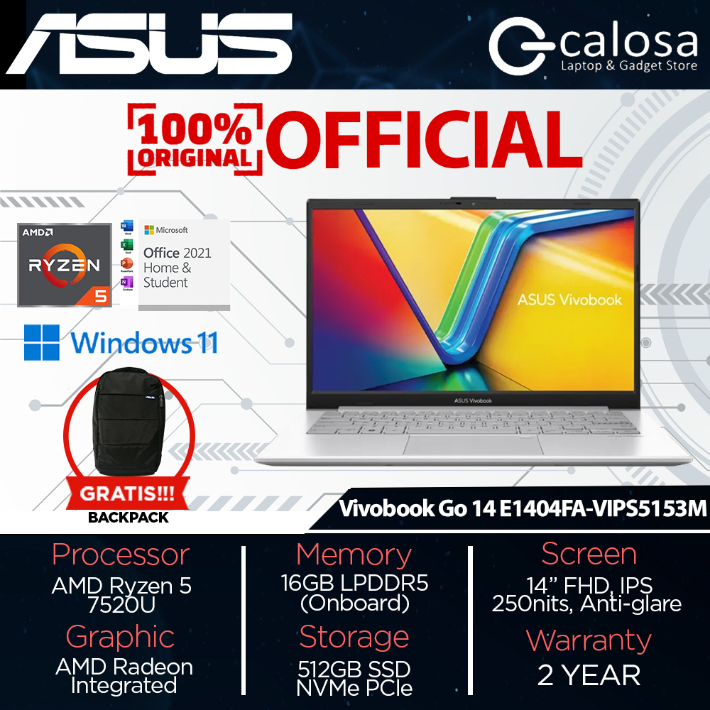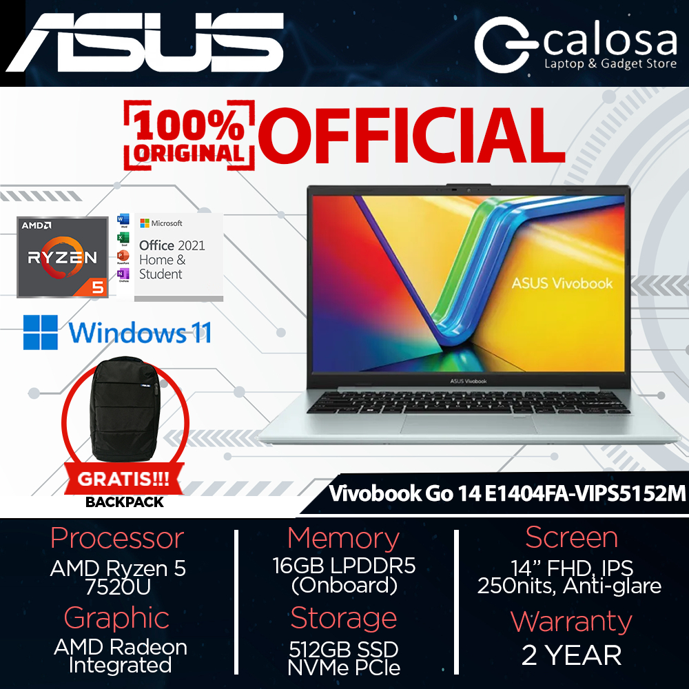 Asus Vivobook Go 14 E1404FA VIPS5151M VIPS5152M VIPS5153M Ryzen 5-7520U RAM 16GB SSD 512GB 14″ FHD IPS Windows 11 Home+O