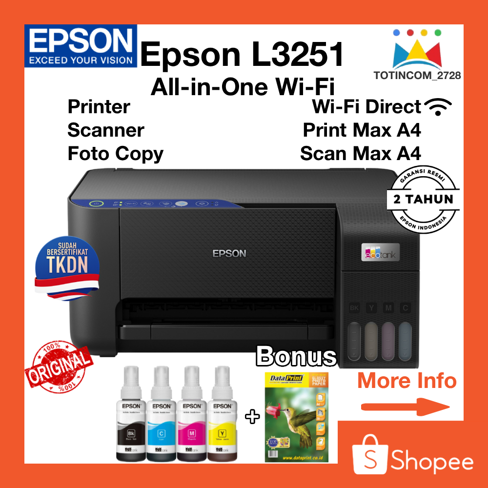 Printer All-in-One Epson L3251 WiFi dengan Scanner A4 Fotocopy A4 Bersertifikat Asli TKDN Garansi Resmi Epson Indonesia