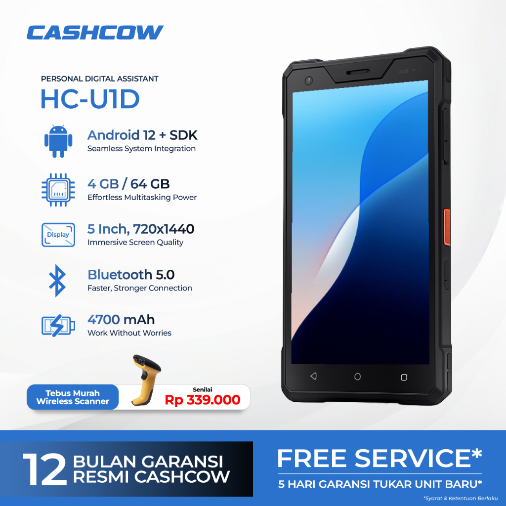 CASHCOW HC-U1D – PDA Scanner 2D Android 9 4/64GB, 5,5Inch, Wi-Fi, 4700mAh, IP67, Support WMS/ERP