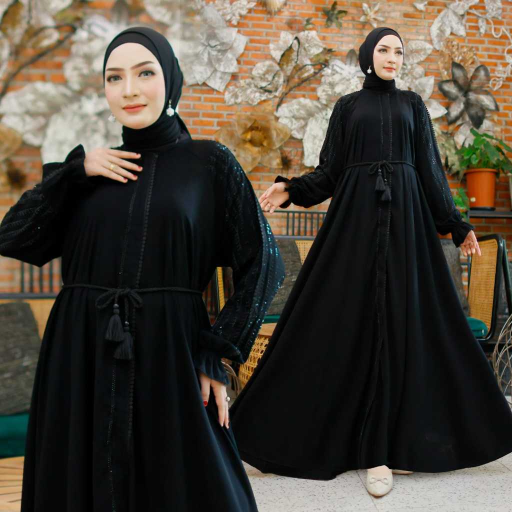 Abaya premium set kerudung pasmina resleting full bisa jadi outer jetblack wolpich dubai terbaru
