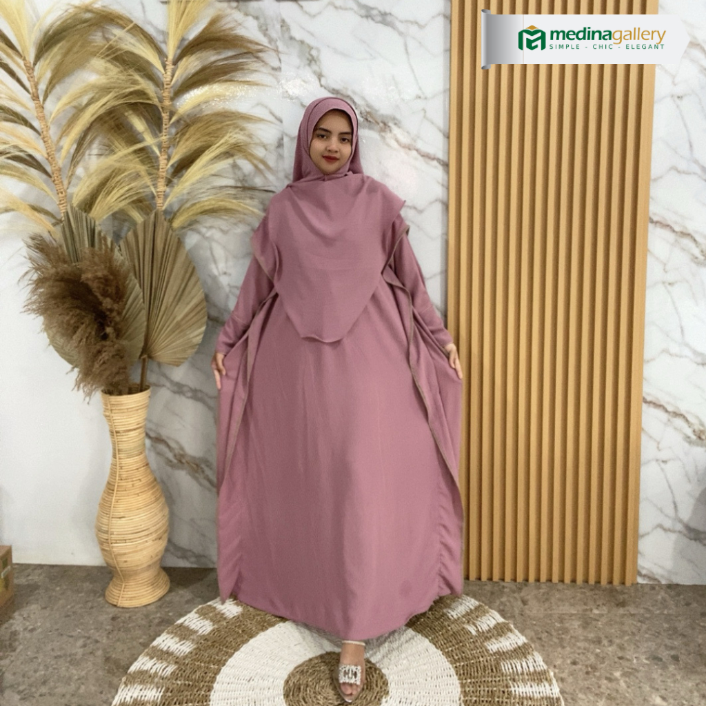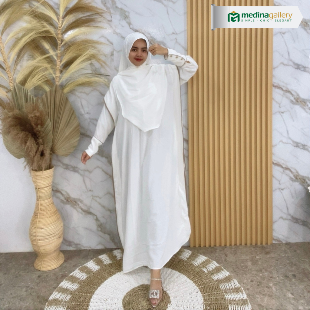 (New) Medina Abaya Kaftan Set Pashmina Oval Umroh Batwing Oversize Gold Button Crinkle Premium