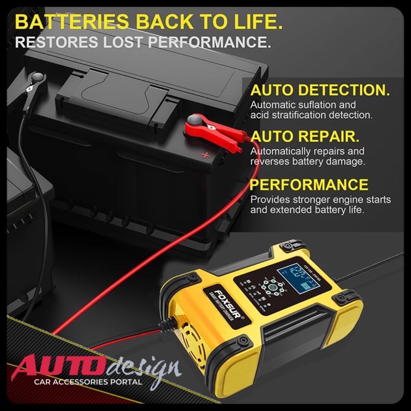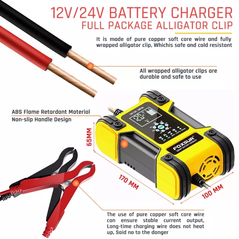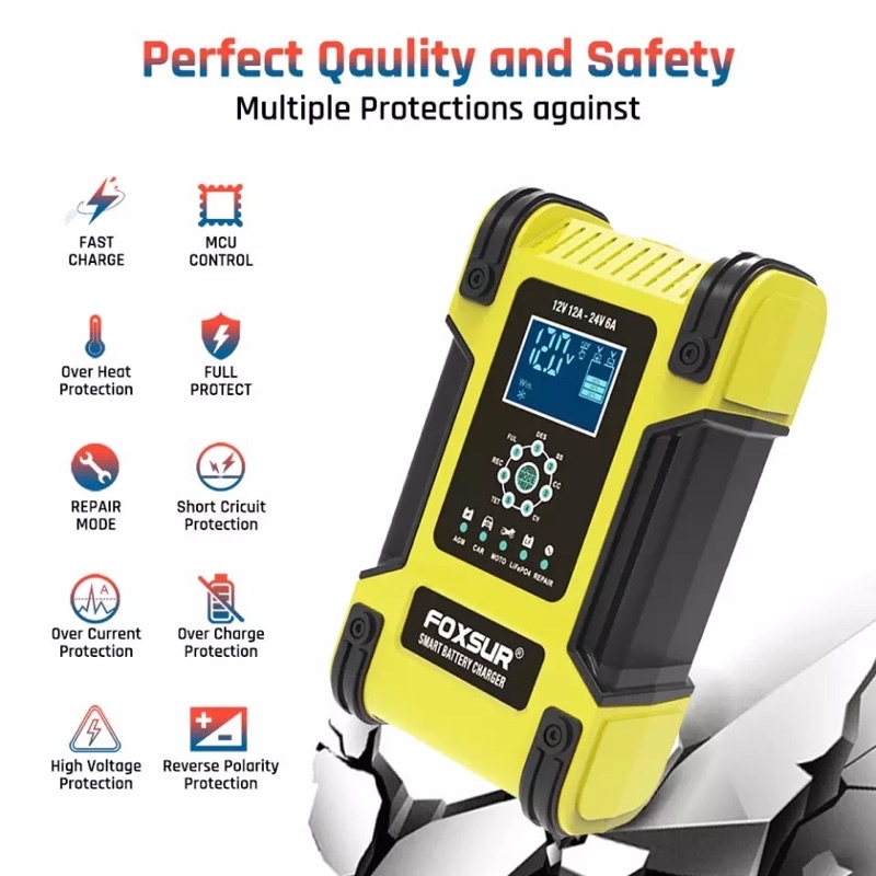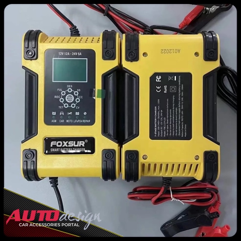 FOXSUR Charger Aki Mobil Motor Truk 12V 12A - 24V 6A Smart Charger 7 Stage Pengisian Original