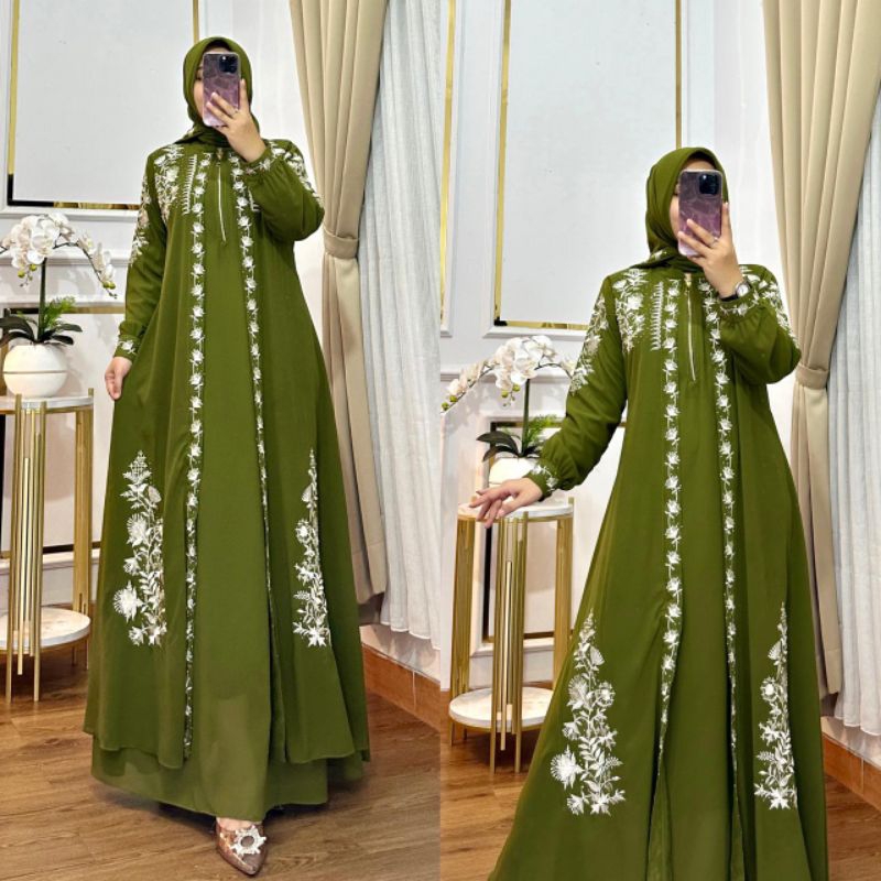 Gamis Bordir Set Hijab Terbaru bahan ceruty baby doll lebaran kekinian gamis kondangan terkini
