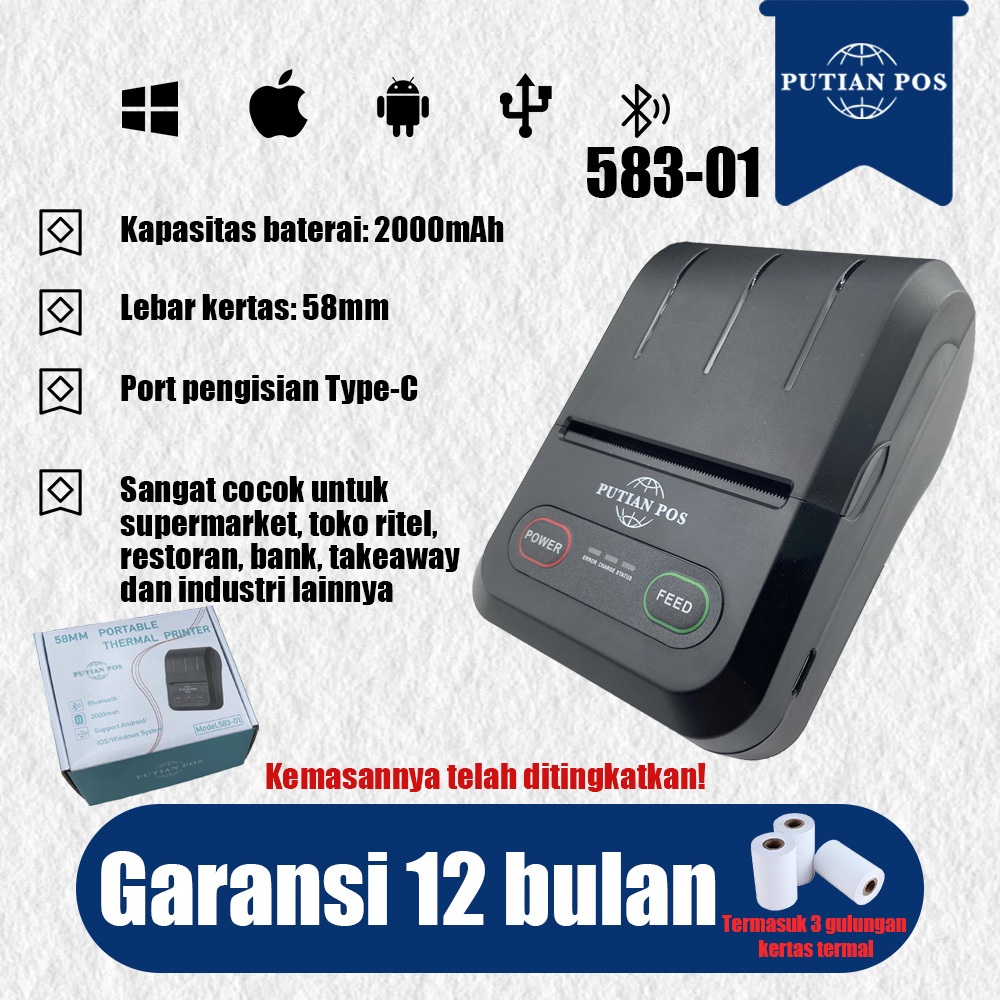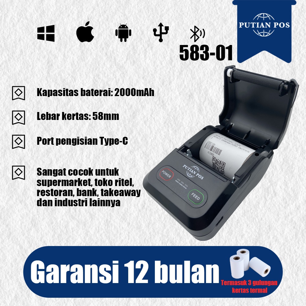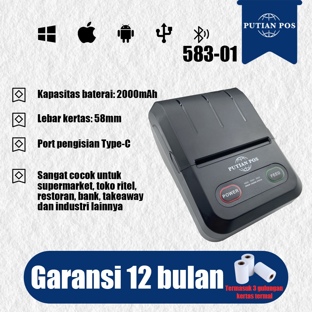PUTIAN POS Printer Termal 58mm Portable Mini Bluetooth Thermal Cash Register Printer 583-01