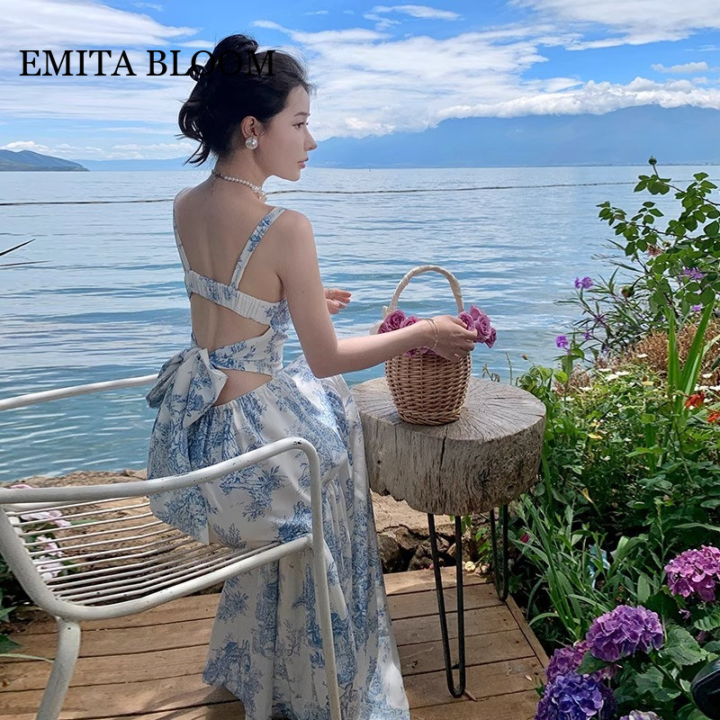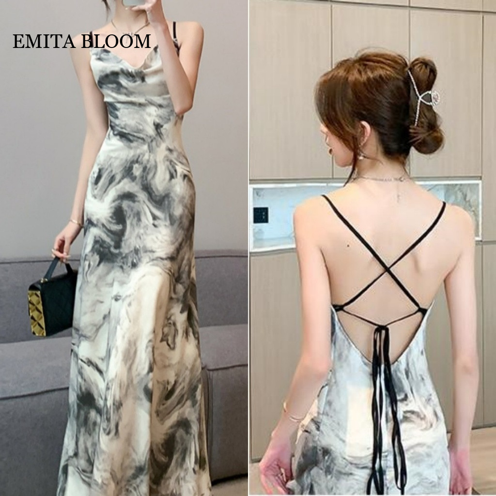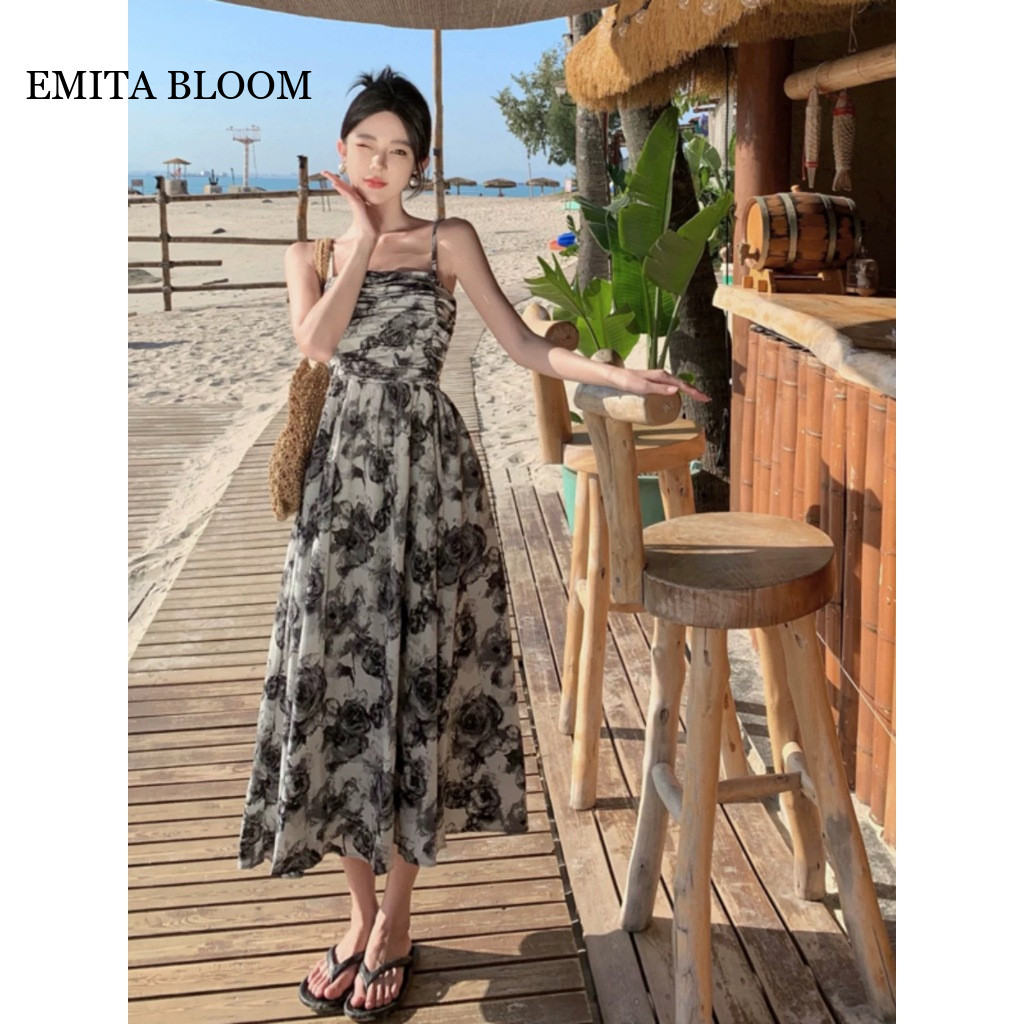EMITA BLOOM DRESS BIRU MUDA BUNGA BUNGA KOREAN STYLE IMPORT WANITA TERBARU 2025 LONG BOHEMIAN DRESS CANTIK KE PANTAI TALI SATU WANITA INNER DRESS TANPA LENGAN MOTIF BUNGA