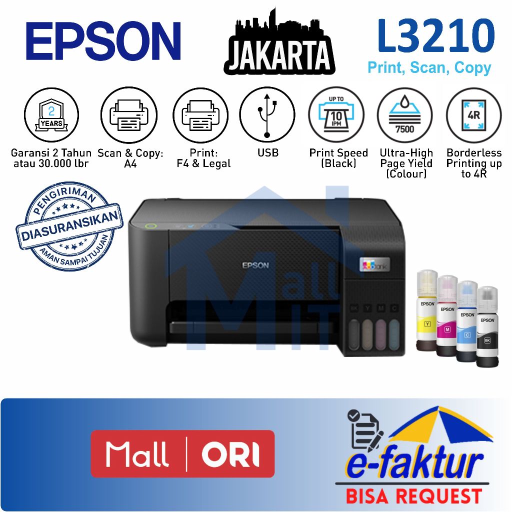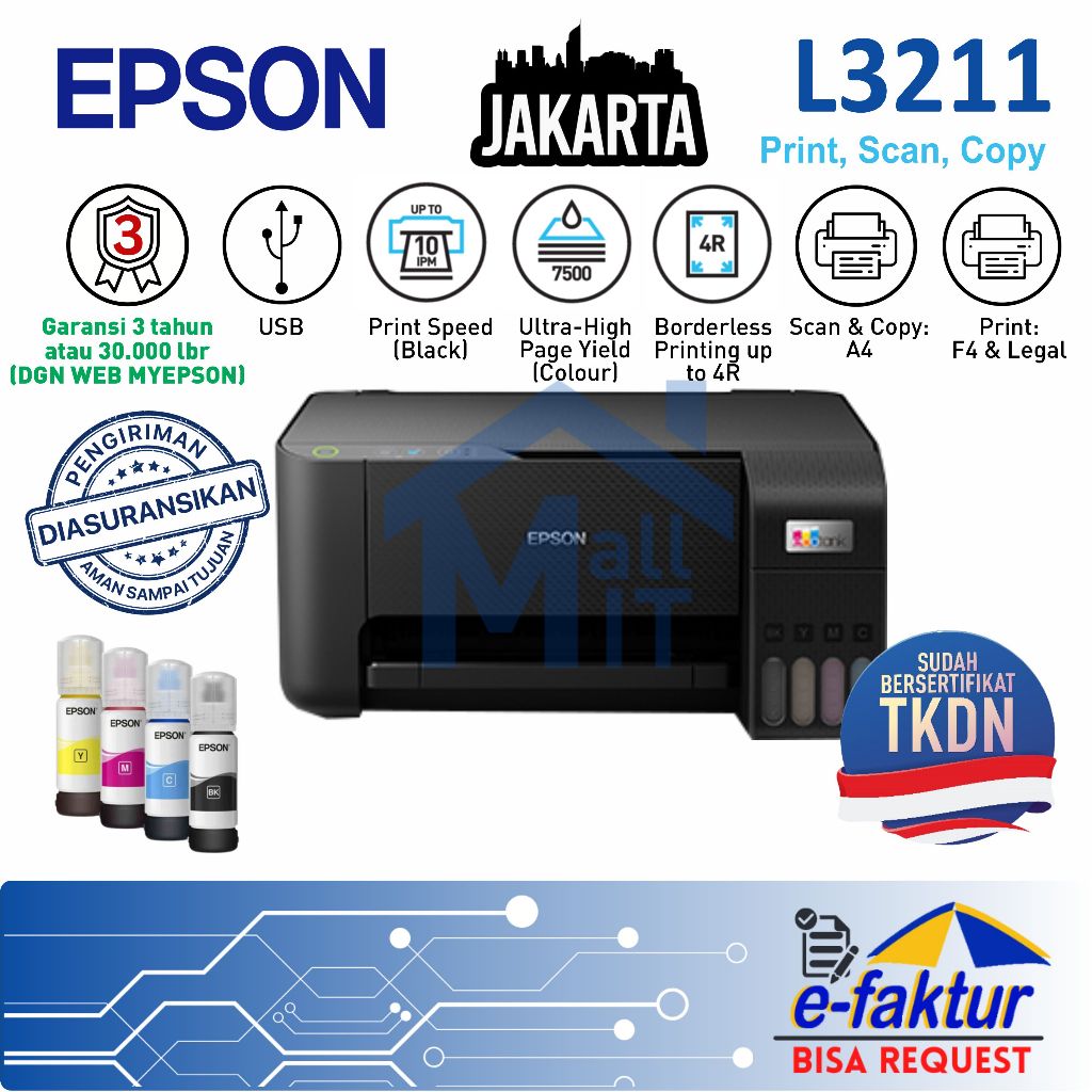 MALLIT EPSON Printer Epson L3210 L-3210 L 3210 L3211 L-3211 L 3211 3 IN 1 Pengganti Epson L3110 Print Scan Copy A4 All i