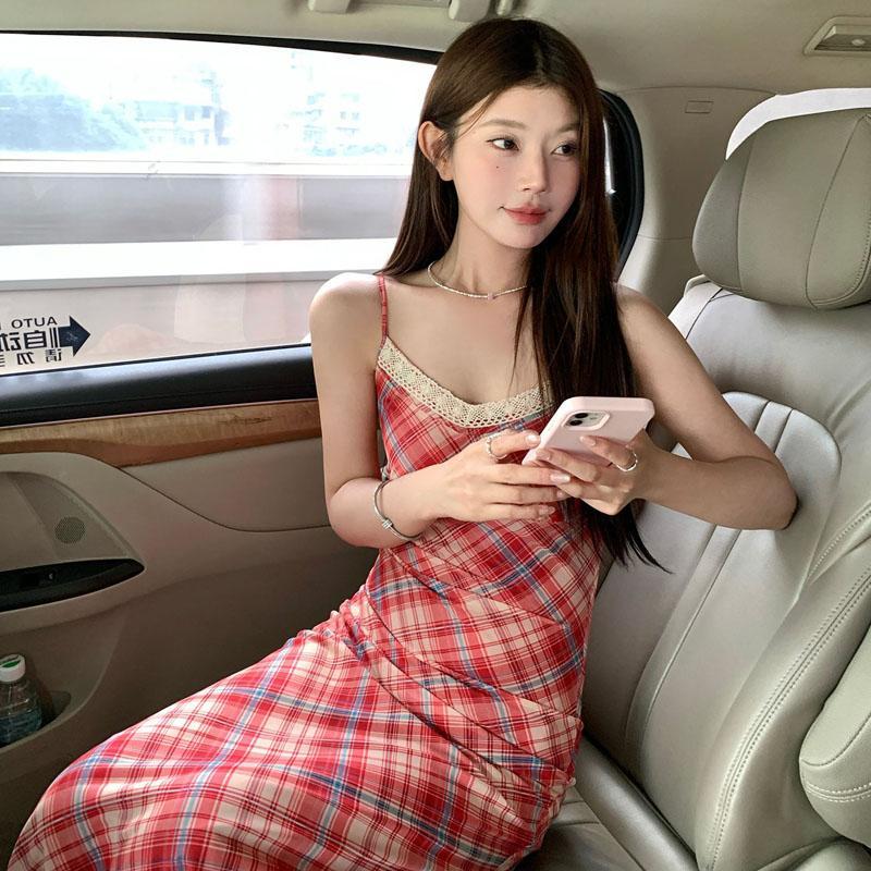 DR8123 LONG DRESS RETRO RED PLAID TALI SPAGETI ELEGANT FIT GAUN OTTD