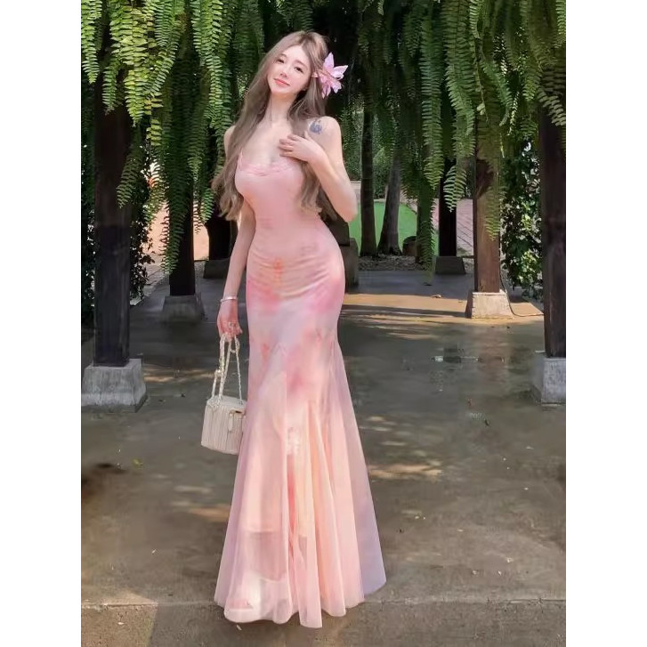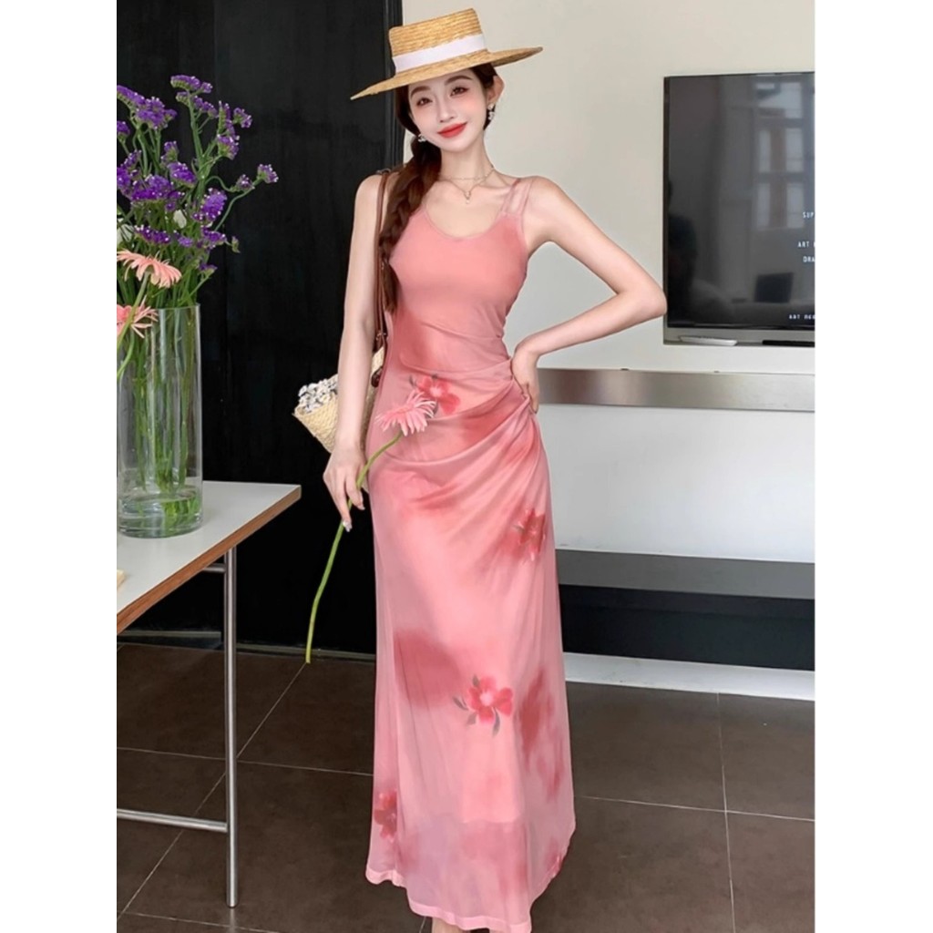 MISS EMITA LONG DRESS PINK SOFT WANITA KEKINIAN PRESS BODY KOREAN STYLE BAJU SUMMER DRESS CANTIK KE PANTAI KOREAN STYLE PARTY DRESS TANPA LENGAN MOTIF BUNGA TERBARU 2025