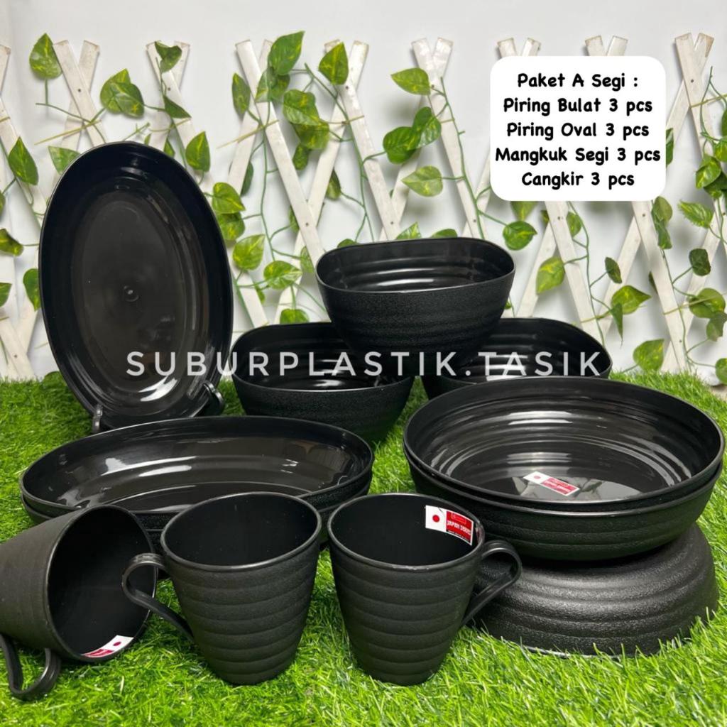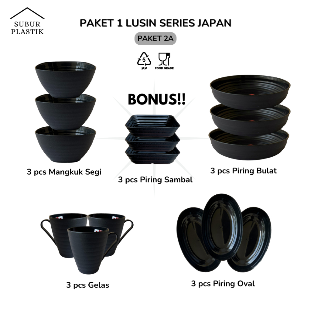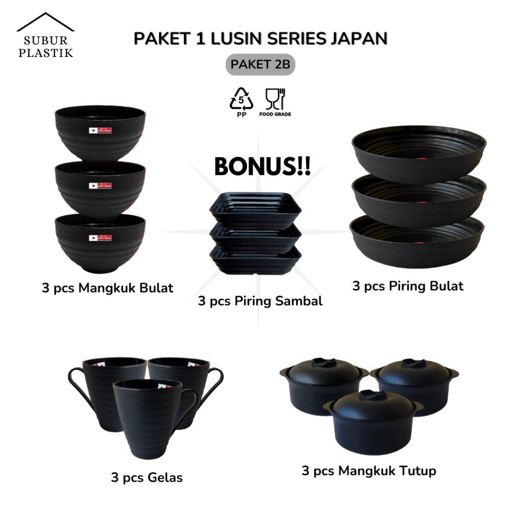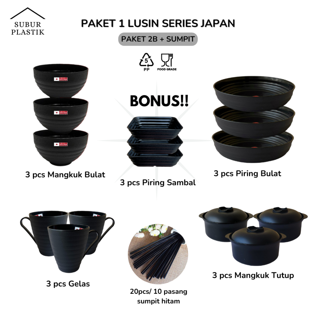Paket 2 Japan Series 1 Lusin Mangkuk Piring Gelas Mangkok Tutup + Sumpit Ramen Plastik Hitam Tebal