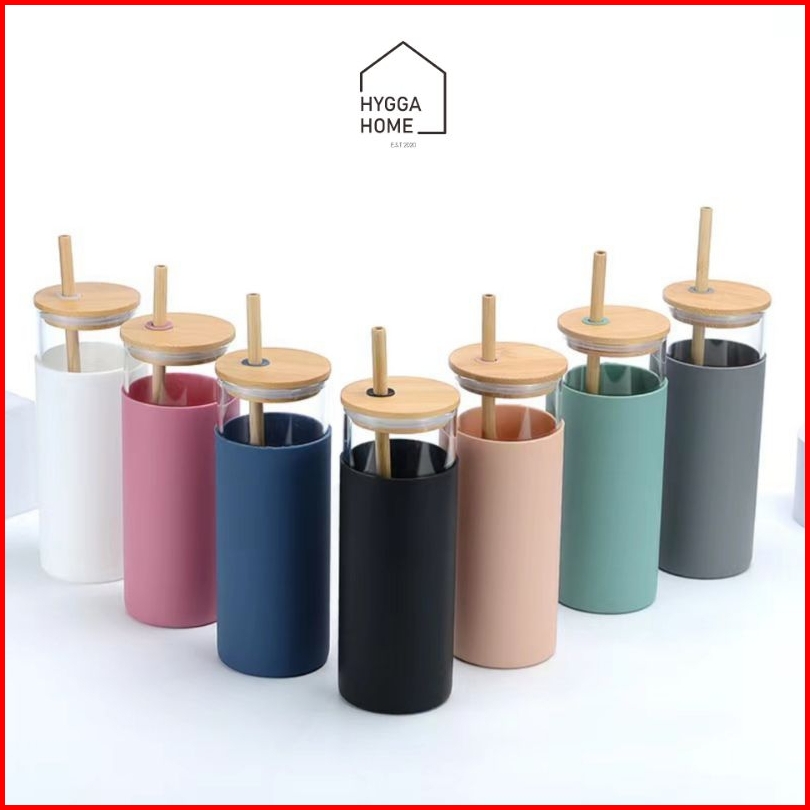 Hygga Home Kenichi Gelas Botol Minum Kaca Dgn Sedotan Tutup Bambu Glass Tumbler Straw