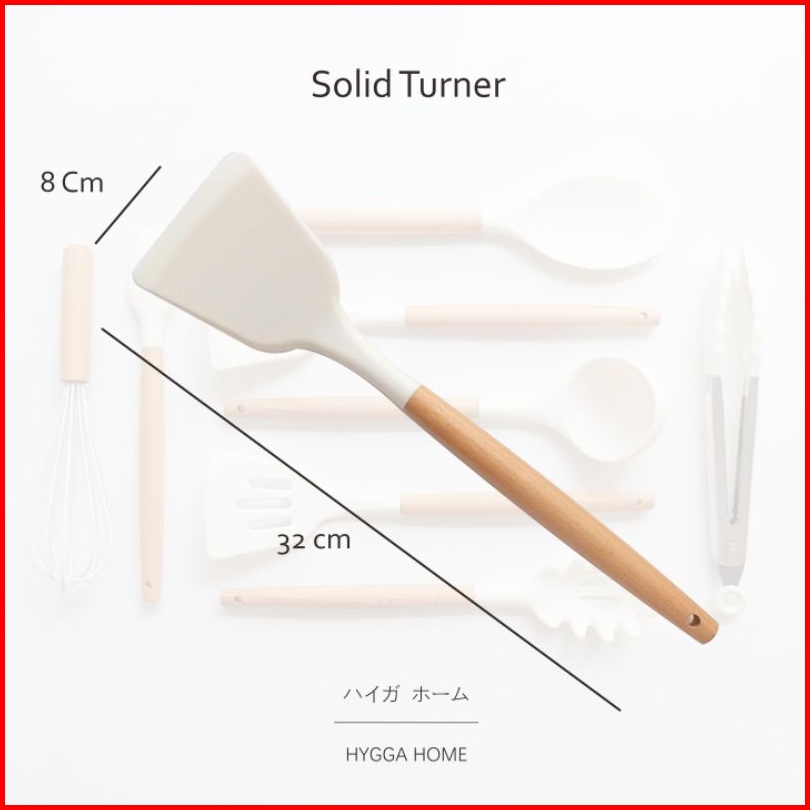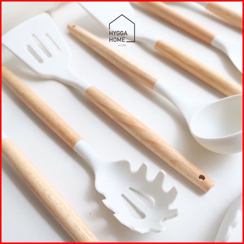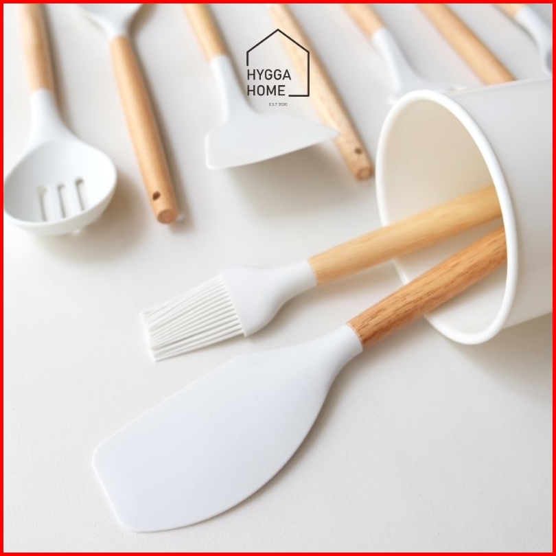 Hygga Home White Silikon Sutil Pencapit Spatula Kuas Sendok Gagang Kayu Silicone Kitchen Utensils