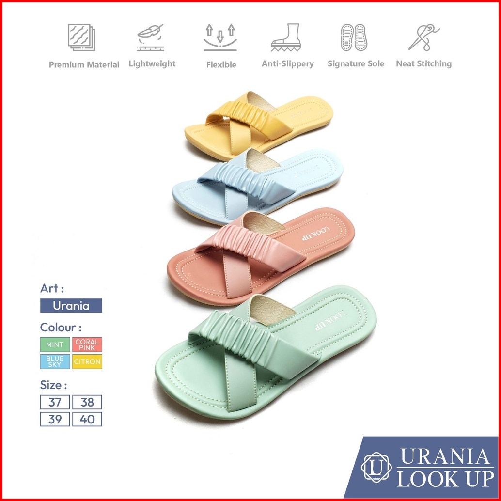 Urania Lookupshoes Sandal Kulit Wanita Flat Teplek Strap Silang Paster Color Mocca Ruffle Flat Series Karet Sendal