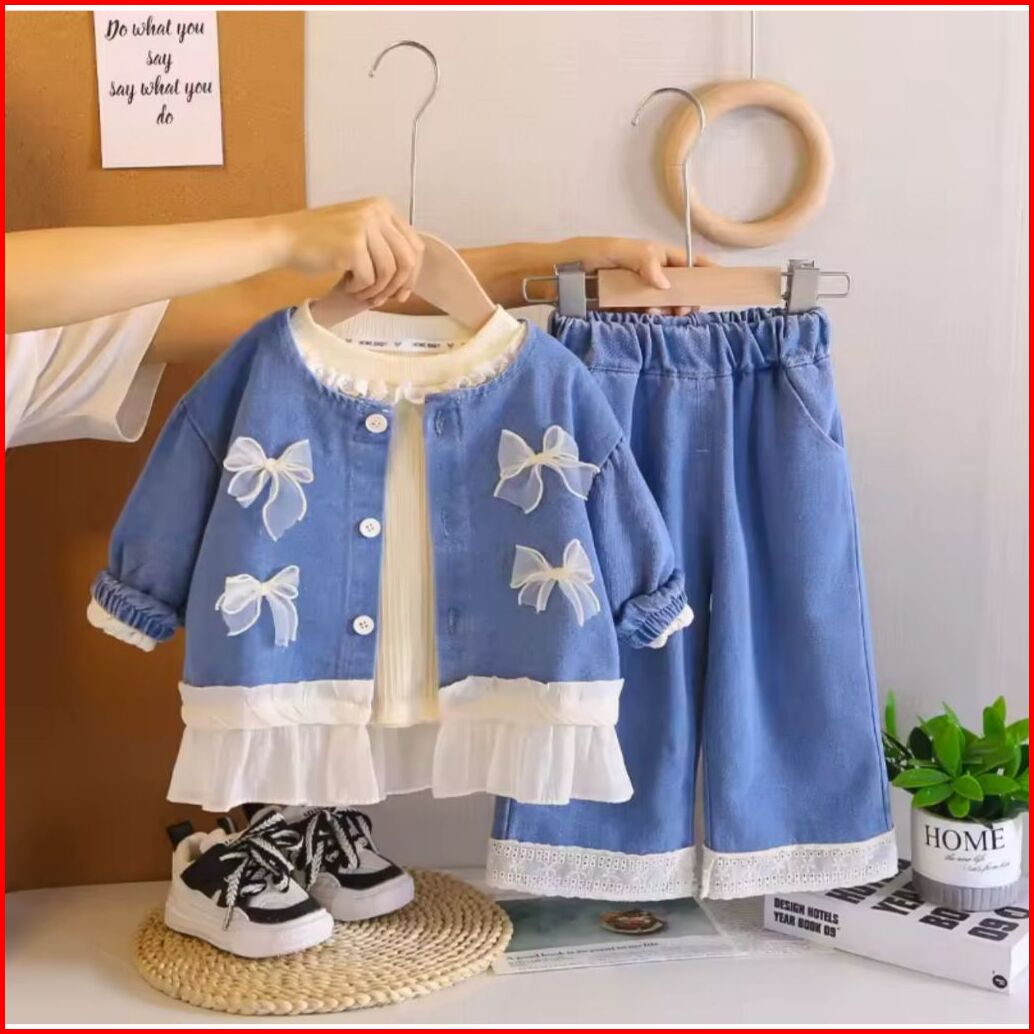 Setelan 3in1 Anak Perempuan Usia 1-5 Tahun Atasan Knit Jaket Denim Lucu Celana Panjang Outfit Anak Korean Style Kekinian