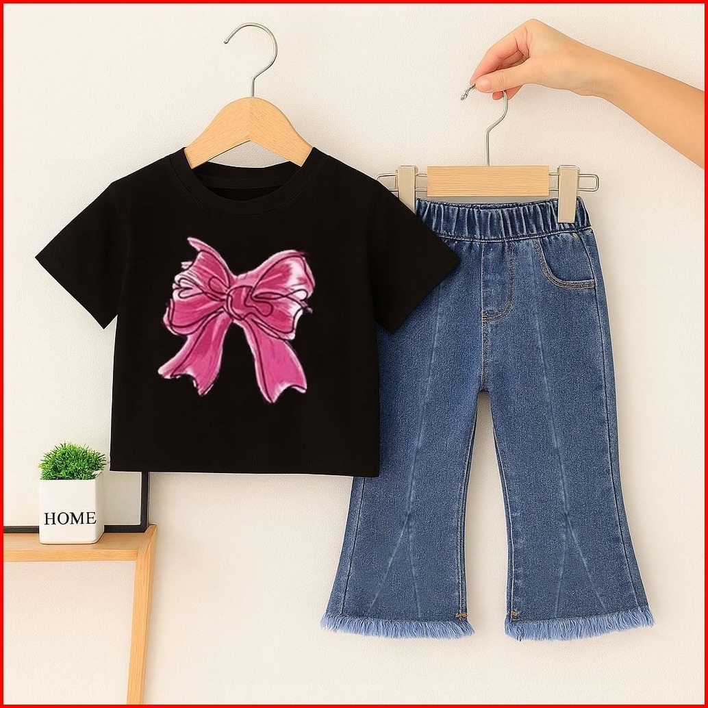 Setelan Anak Perempuan Baju Anak Celana Jeans Panjang Motif Pita Korean Style Usia 1-5 Tahun Set Model Kekinian Oneset T