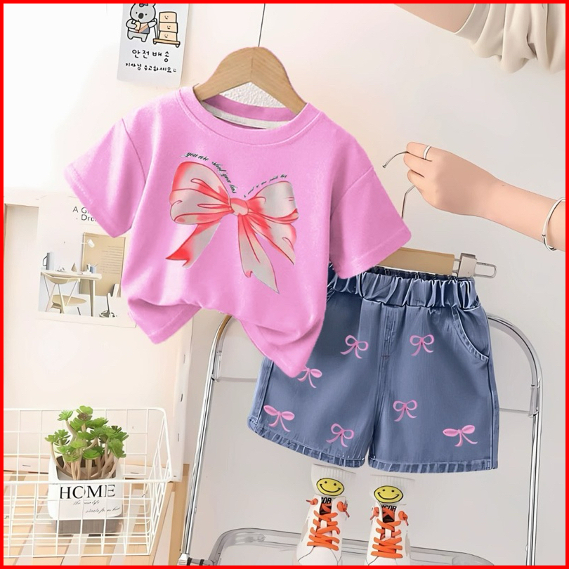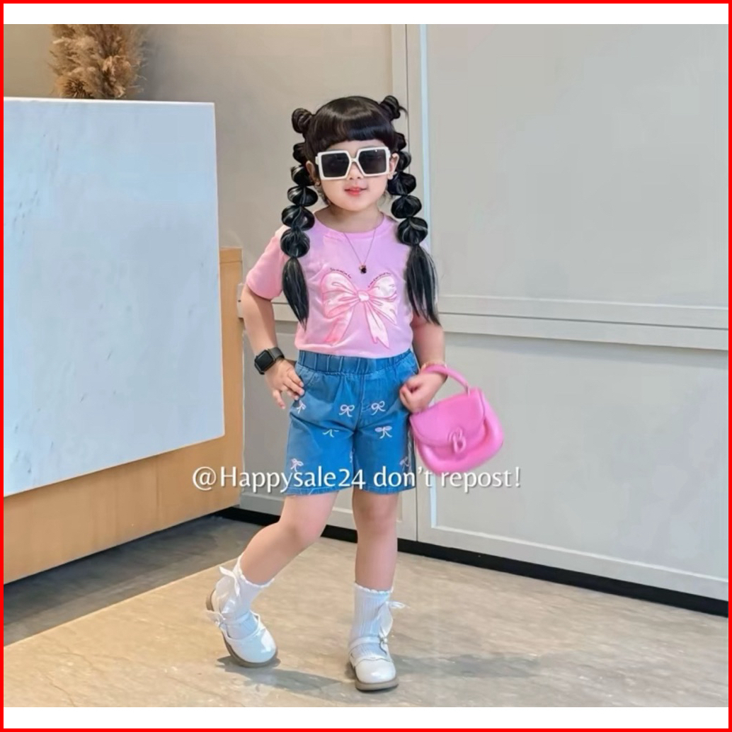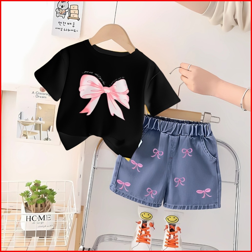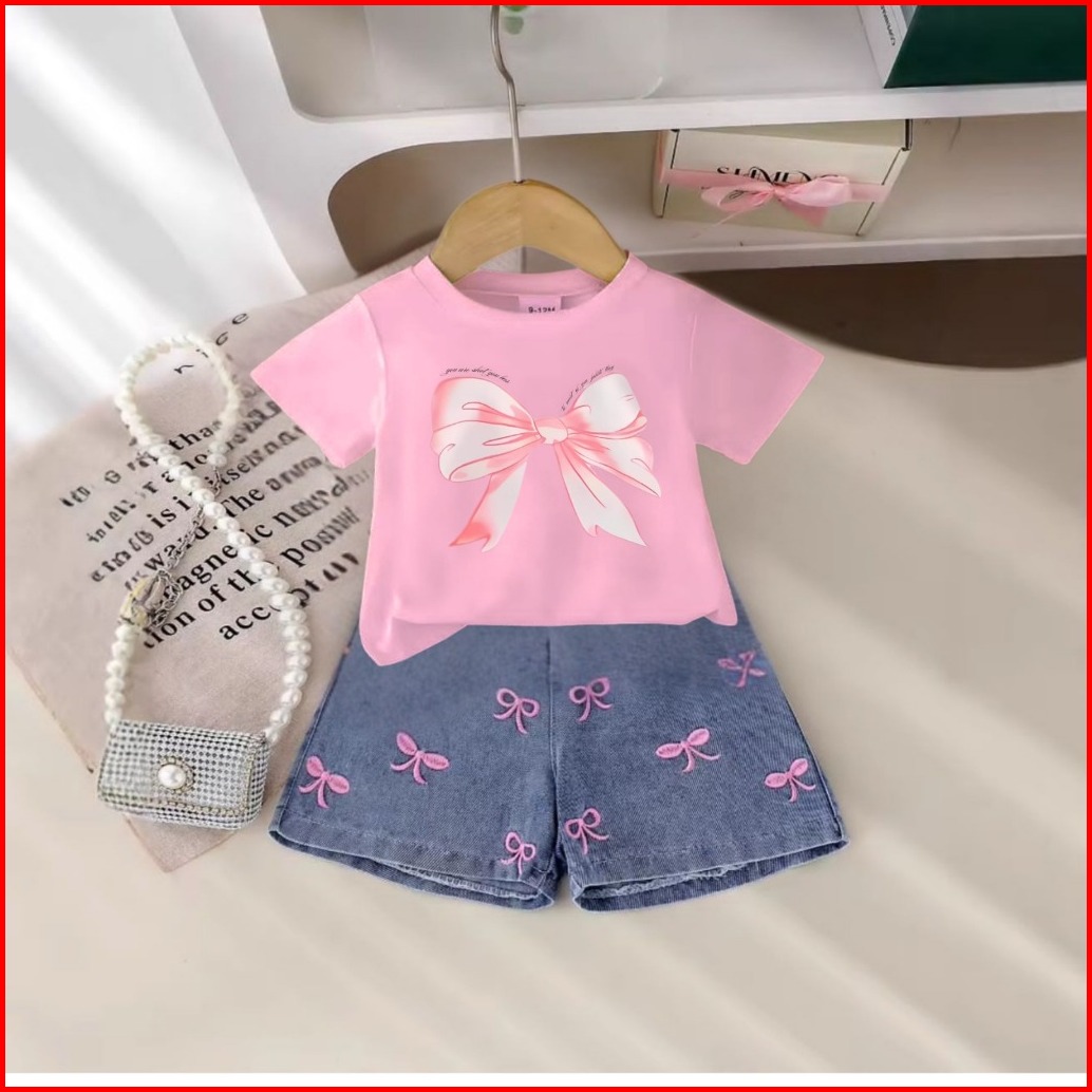 Setelan Anak Perempuan Jeans Denim Usia 1-5 Tahun Motif Pita Nashwa Set Anak Kaos Celana Jeans Terbaru Dan Kekinian