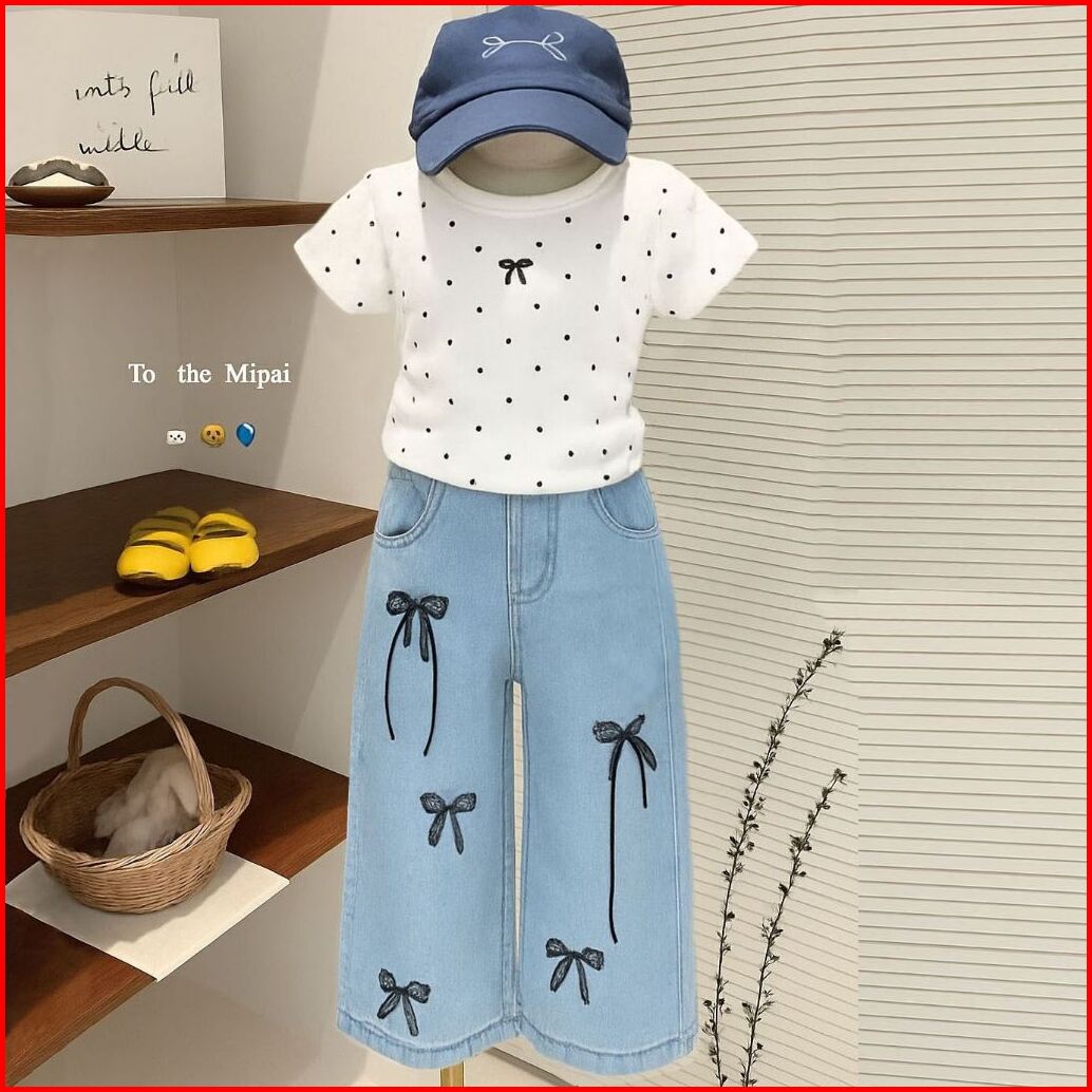 Setelan Anak Perempuan Kaos Polkadot Celana Jeans Kulot Motif Pita Lucu Usia 1-5 Tahun Baju Setelan Anak Terbaru