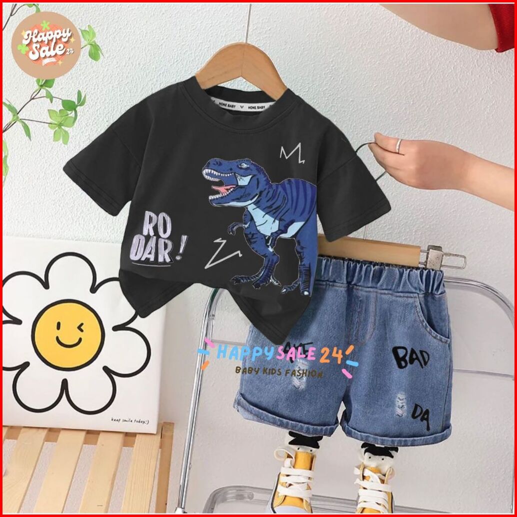 Setelan Anak Laki Laki Perempuan Usia 1-5 Tahun Baju Kaos Motif Dino Bad Celana Jeans Denim Set Pakaian Terbaru Dan Keki