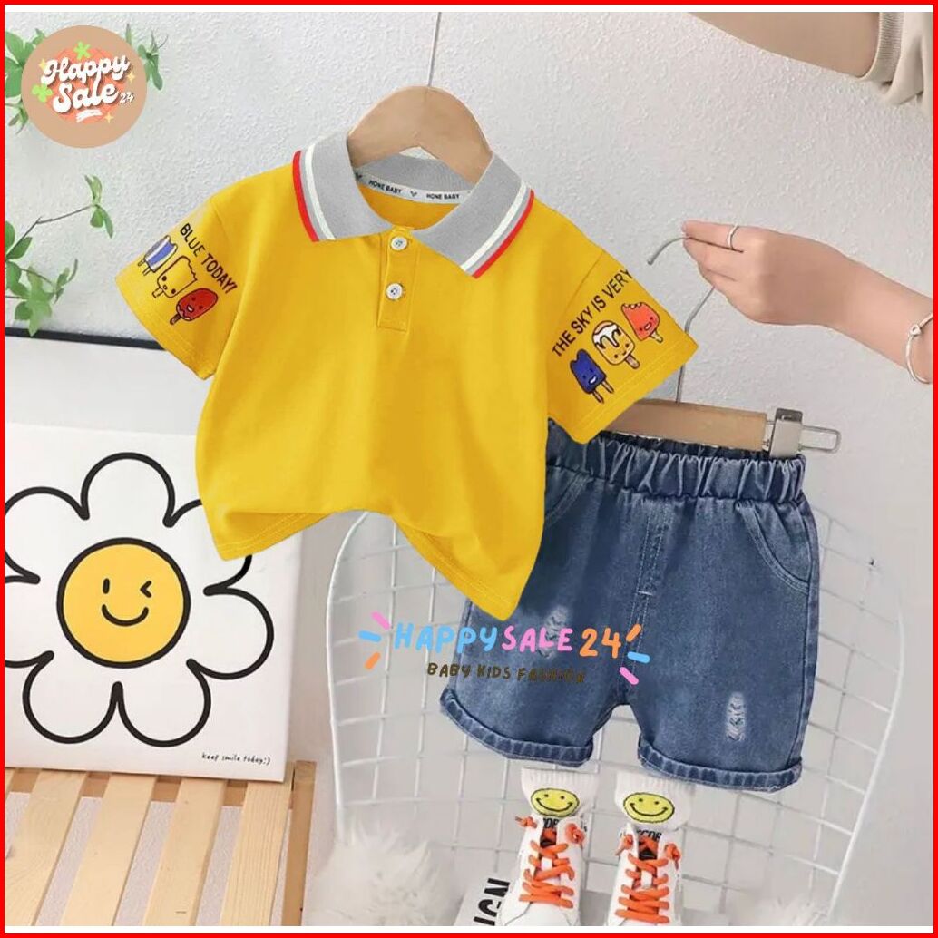 Setelan Anak Laki Laki Kaos Polo Kuning Celana Jeans Pendek Baju Anak Cowok Casual Keren Usia 1-5 Tahun