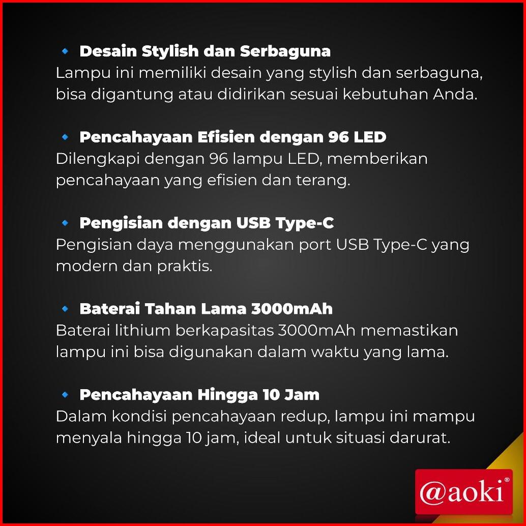 Aoki Lampu Darurat Serbaguna Ultra Terang Modern Serbaguna Baterai Lithium Tahan Lama Portabel Dengan 96 Led