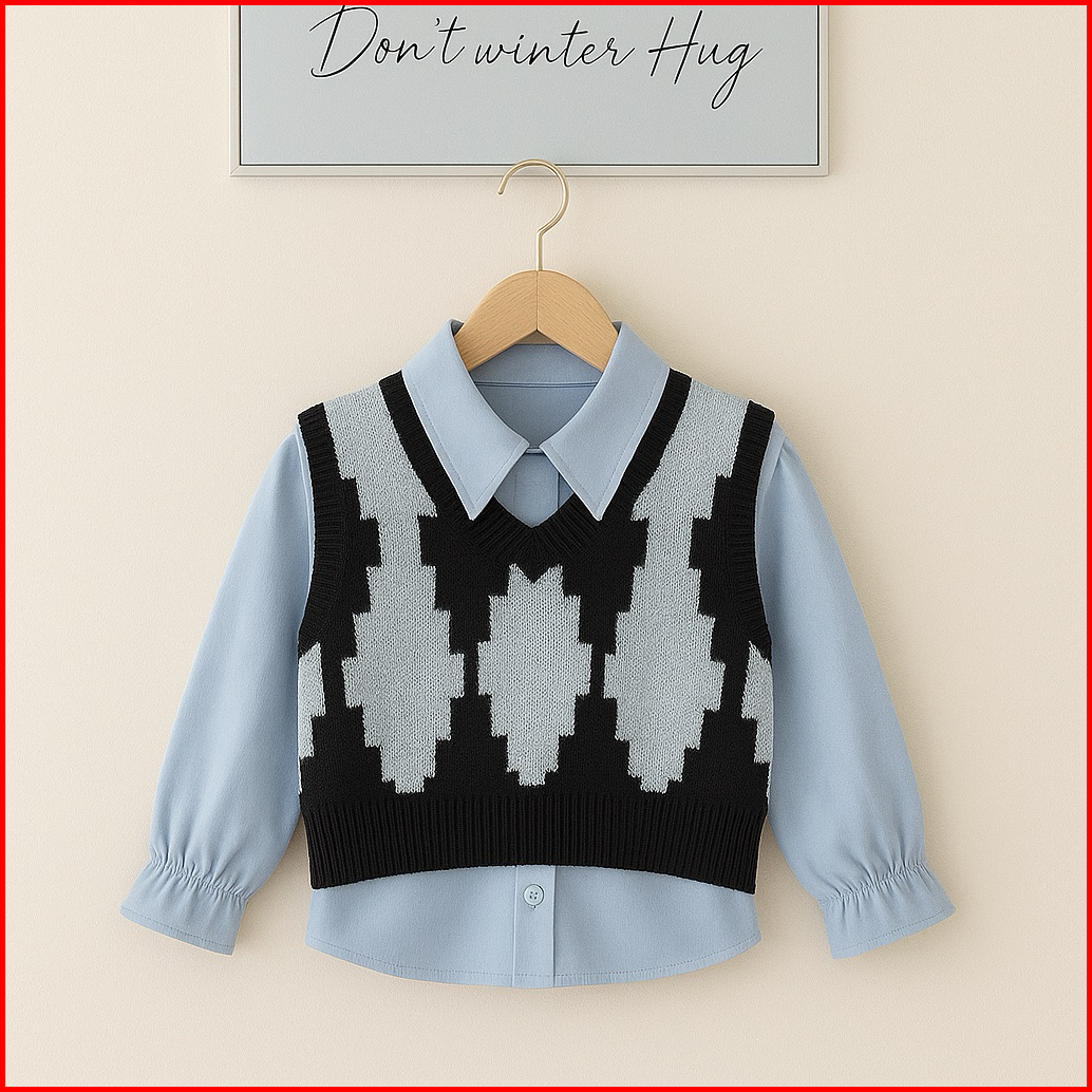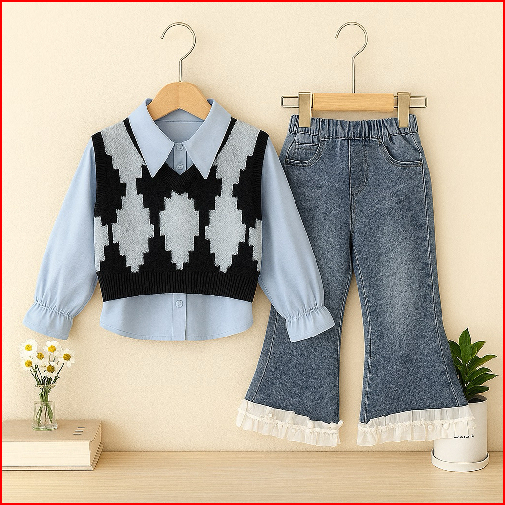 Setelan Anak Perempuan Stylish Usia 1-5 Tahun 3in1 Kemeja Rompi Rajut Celana Jeans Cutbray Outfit Anak Perempuan Fashion