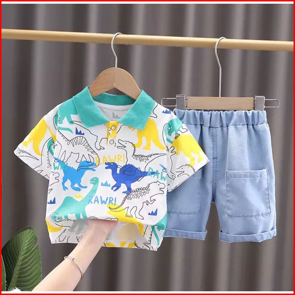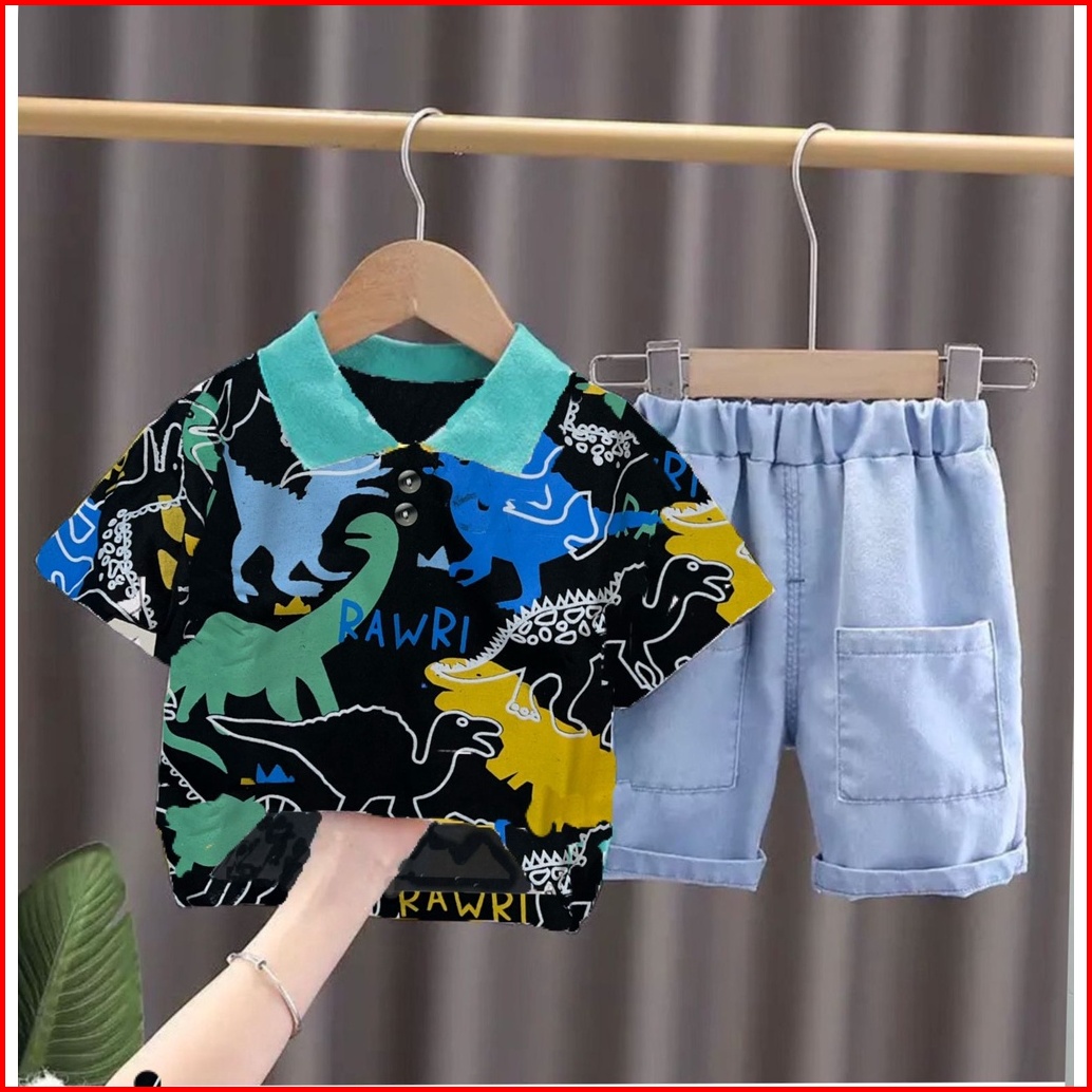 Setelan Anak Baju Anak Dino Usia 1-5 Tahun Setelan Jeans Denim Anak Laki Laki Perempuan One Set Anak Kekinian