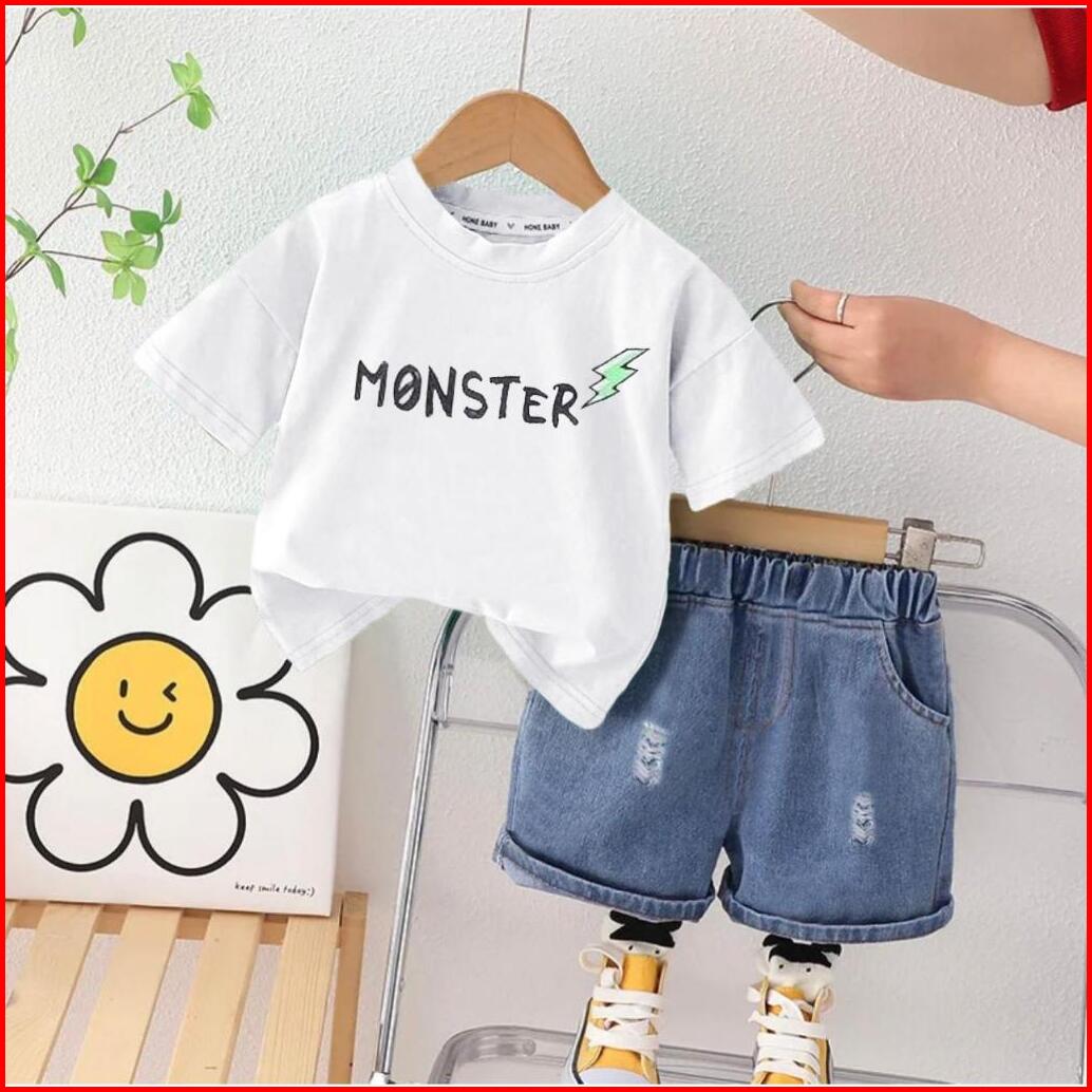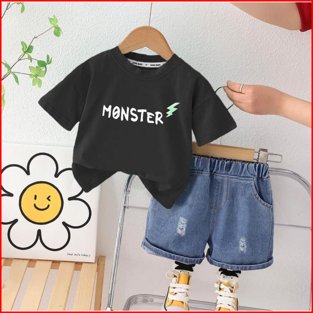 Setelan Anak Laki-laki Usia 1-5 Tahun Kaos Anak Celana Jeans Denim Motif Monsters Top Fashion Anak Set Pakaian Terbaru D