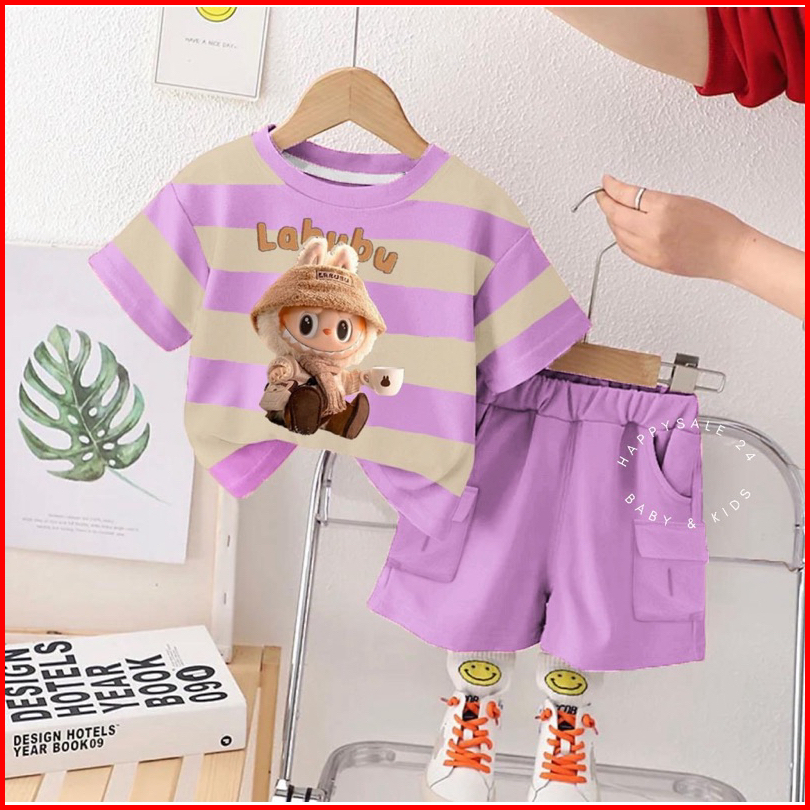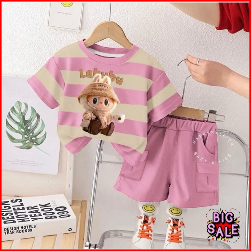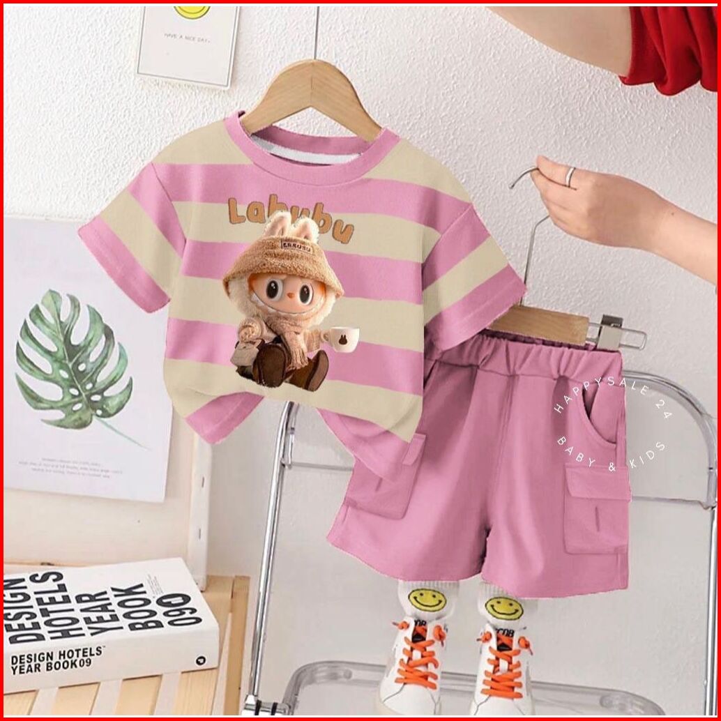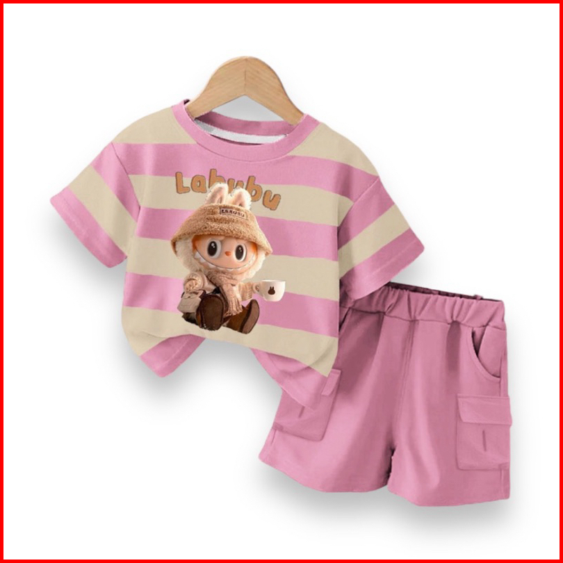 Setelan Anak Labubu Salur Lengan Pendek Celana Pendek Cargo Usia 1-5 Tahun Baju Anak Laki-laki Baju Anak Perempuan