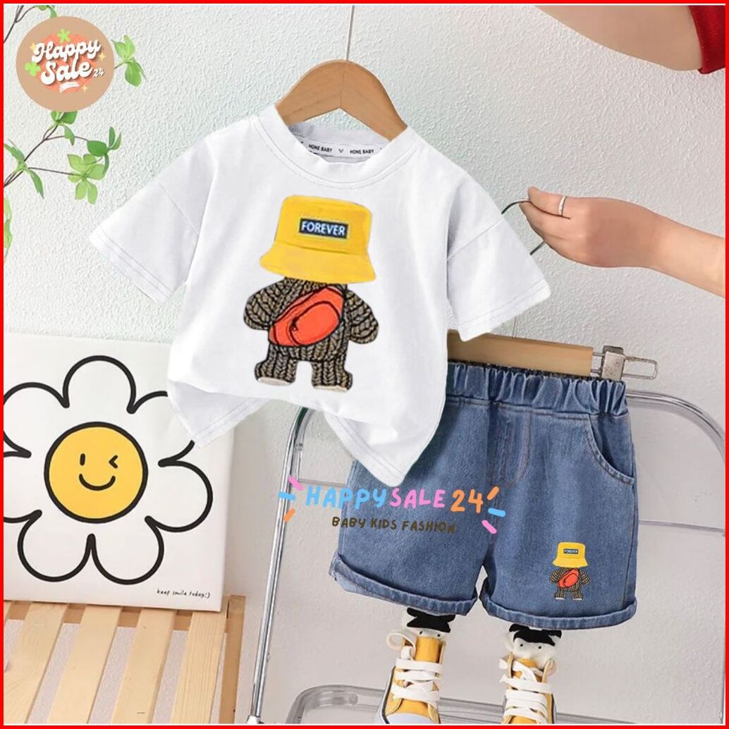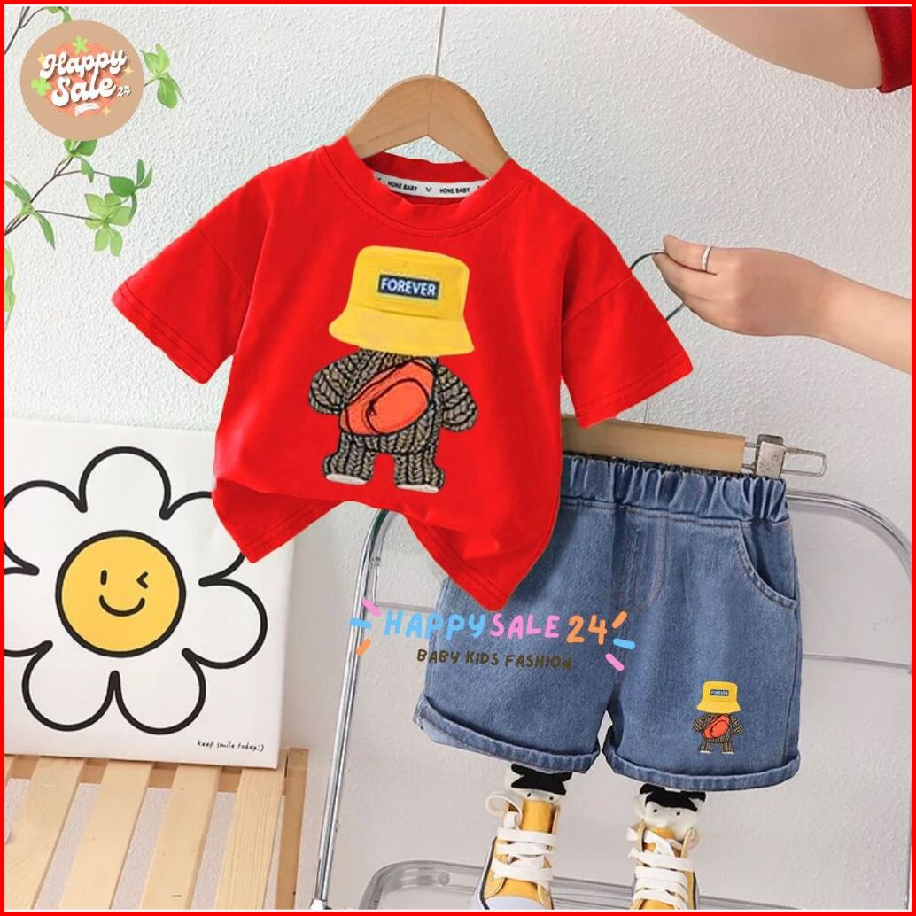 Setelan Anak Laki Laki Perempuan Usia 1-5 Tahun Baju Kaos Motif Forever Celana Jeans Denim Set Pakaian Terbaru Dan Kekin