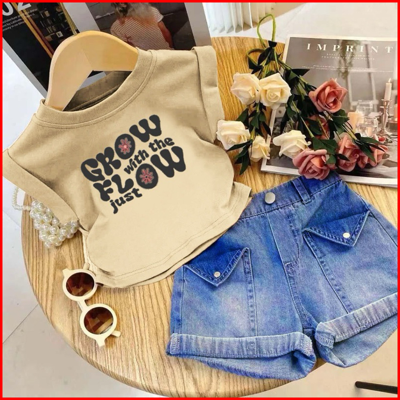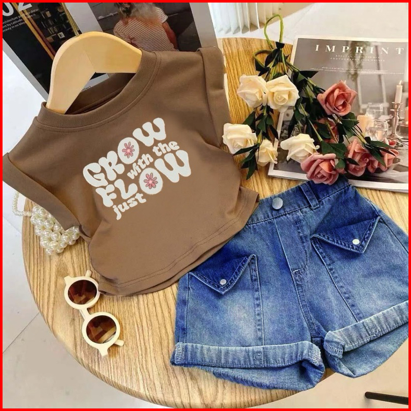 Setelan Anak Perempuan Jeans Denim Usia 1-5 Tahun Motif Grow Flow Set Anak Kaos Celana Jeansterbaru Dan Kekinian
