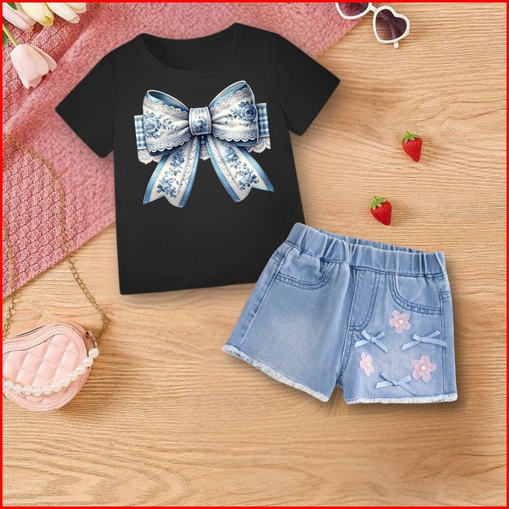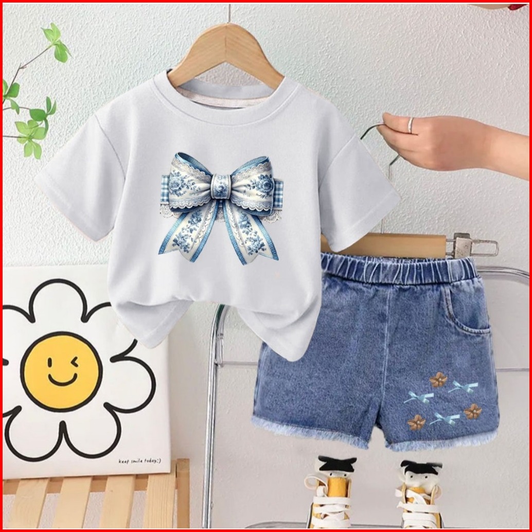Setelan Anak Perempuan Jeans Denim Usia 1-5 Tahun Motif Pita Set Anak Kaos Celana Jeans Terbaru Dan Kekinian