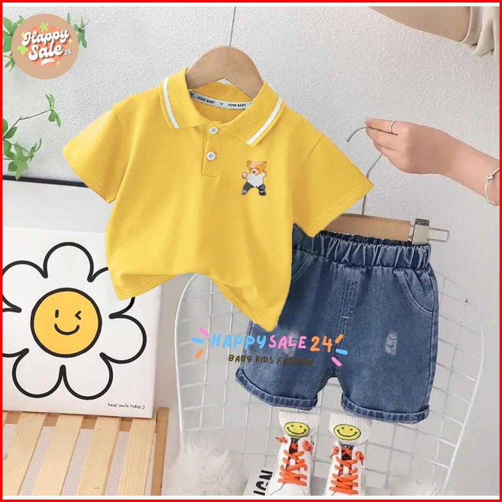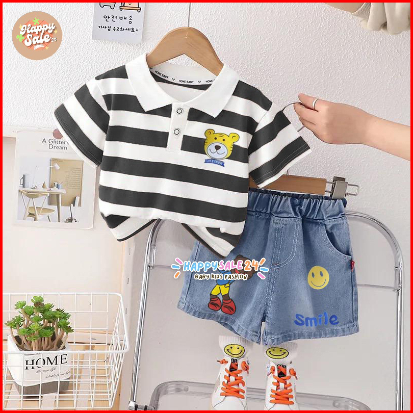 Setelan Baju Anak Laki Perempuan Kaos Polo Stripes Hitam Putih Celana Jeans Pendek Smile Lucu Usia 1-5 Tahun