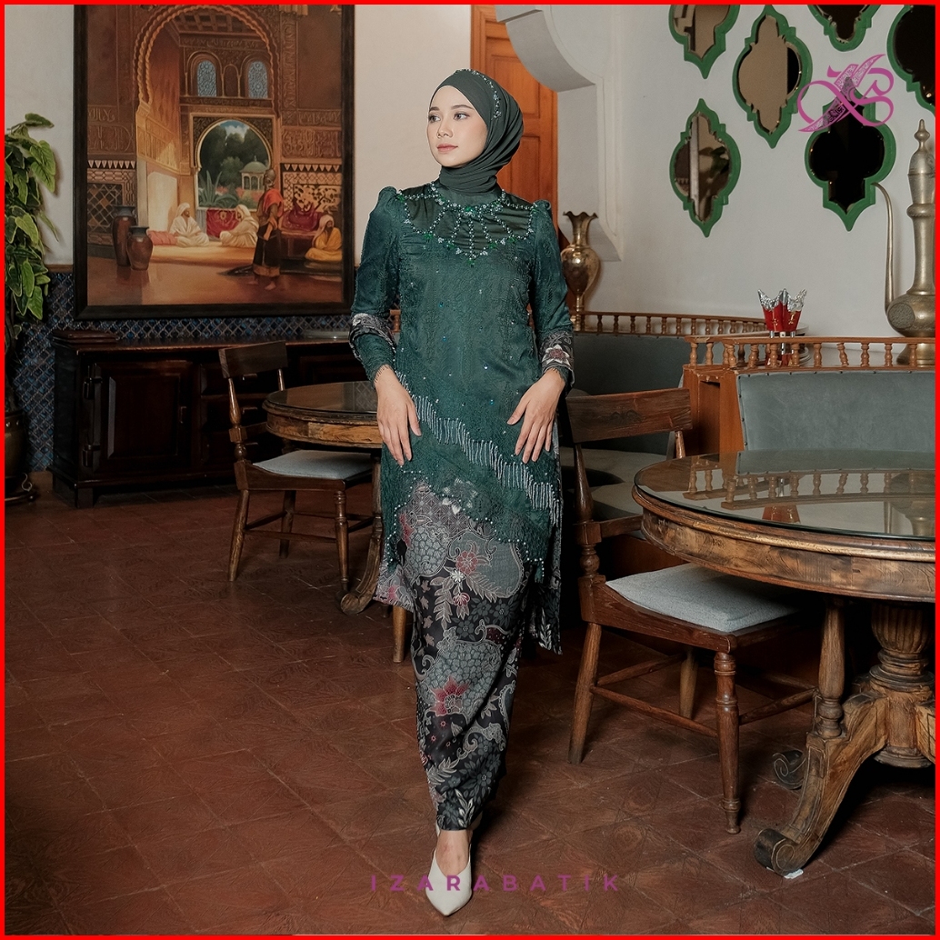 Izarabatik - Ceitlyn Hijau Botol Set Kebaya Modern Couple Wisuda Lamaran Full Payet Tunangan Kondangan Bridesmaid