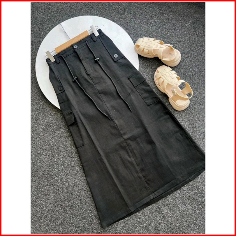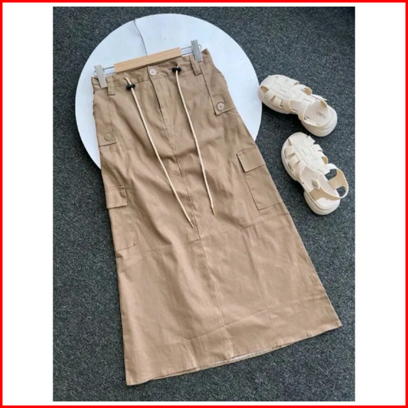 Rok Cargo Panjang Wanita Casual Cargo Skrit Span Twill Combed Premium Halus Dan Tebal
