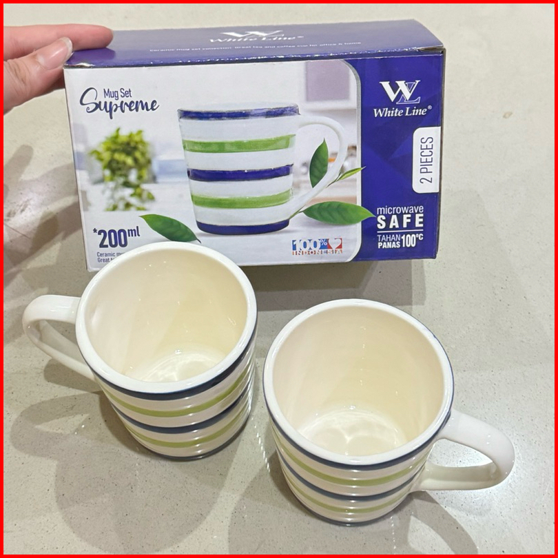 2 Pcs Gelas Gagang Keramik Mug Set Supreme Garis Garis Warna Warni Unik White Line