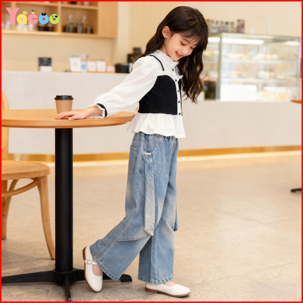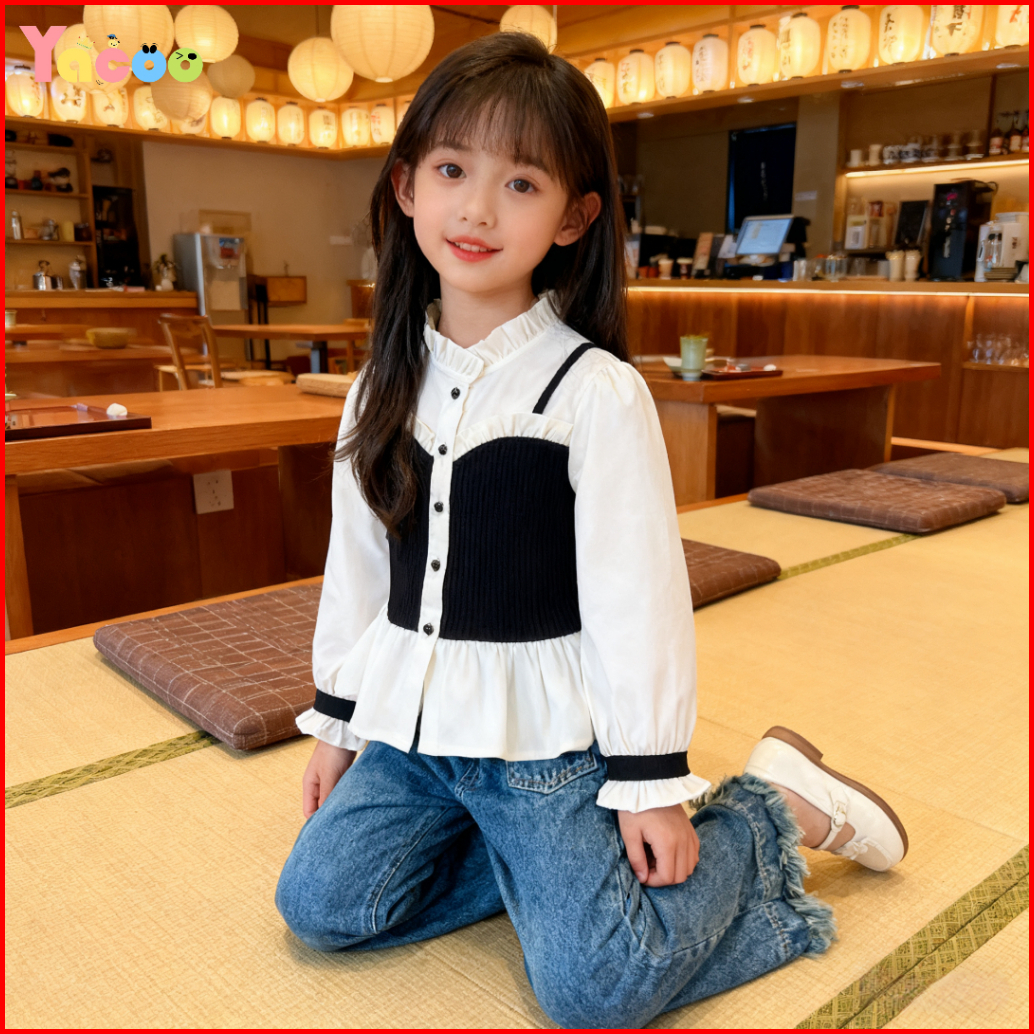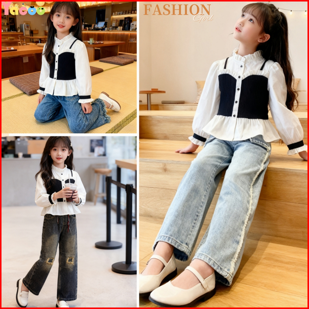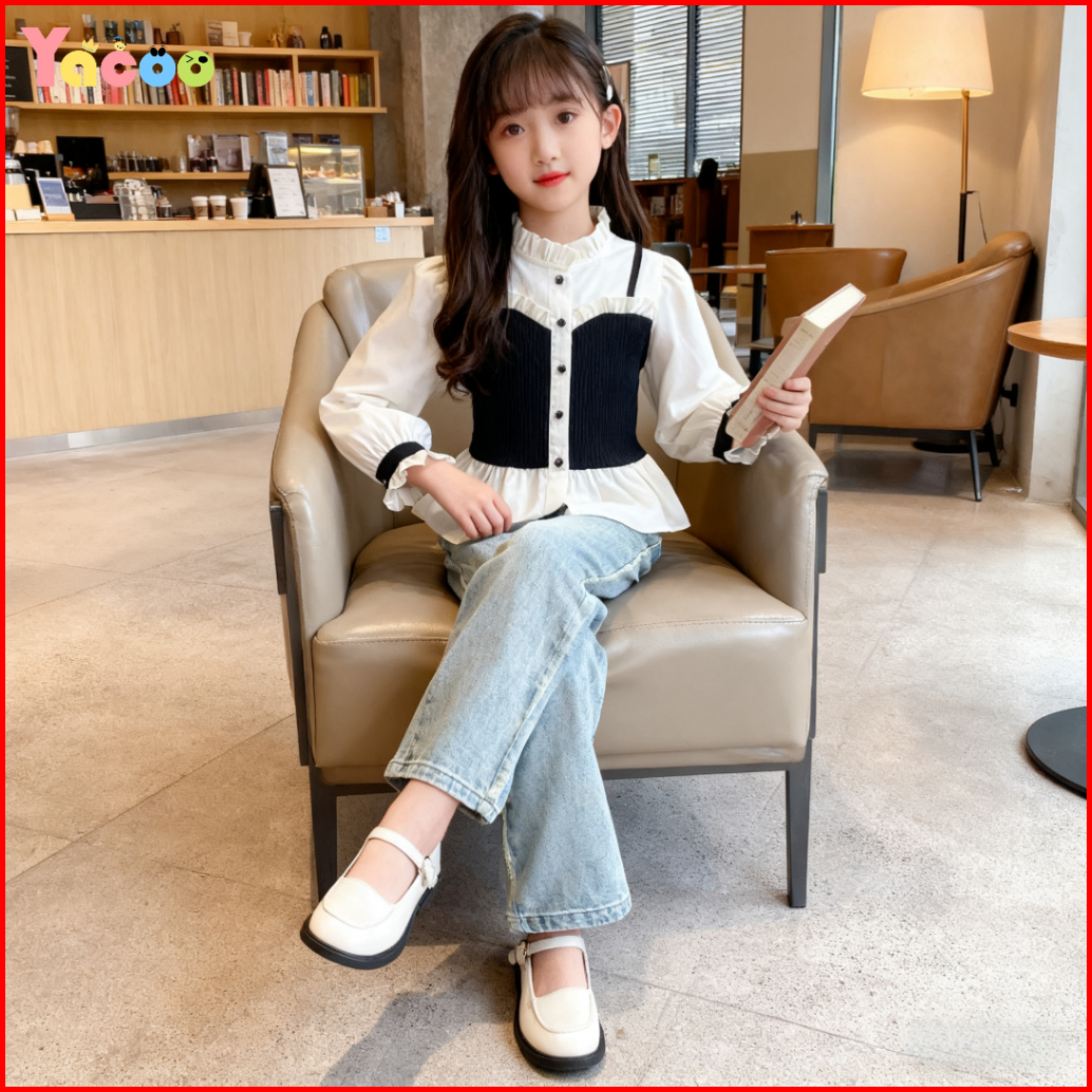 Yacoo Setelan Anak Perempuan Kemeja Anak Perempuan Korean Style Celana Jeans Set 3-12 Tahun Lengan Panjang Stylish
