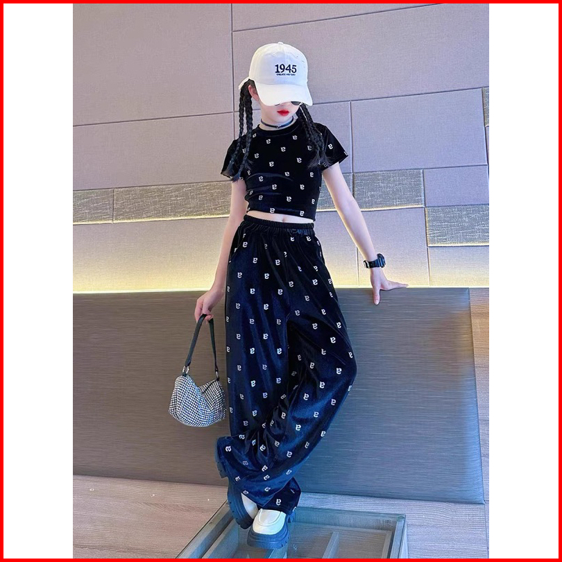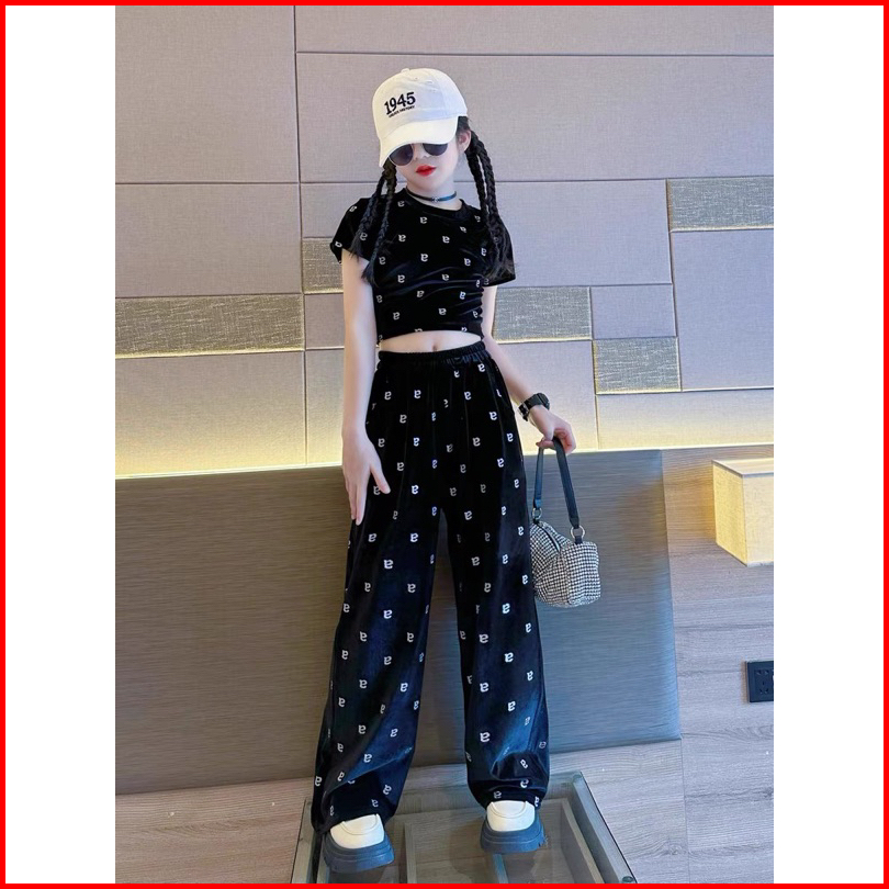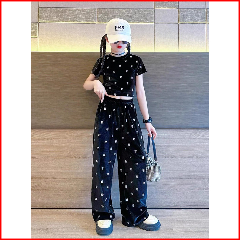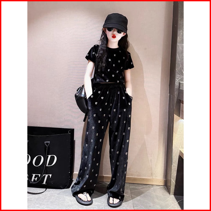 Js28 Setelan Anak Perempuan Crop Kulot Velvet Bludru Lengan Pendek Celana Panjang Hitam Baju Anak Perempuan Tanggung