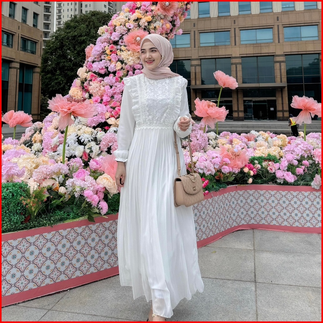 Fanmu Gamis Putih Plisket Wanita Long Dress Brukat White Kondangan Pesta Muslim Wanita