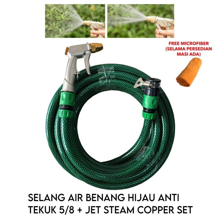SELANG AIR HIJAU BENANG ANTI TEKUK 5/8 + SPRAY JET STEAM COPPER SET - 6 M