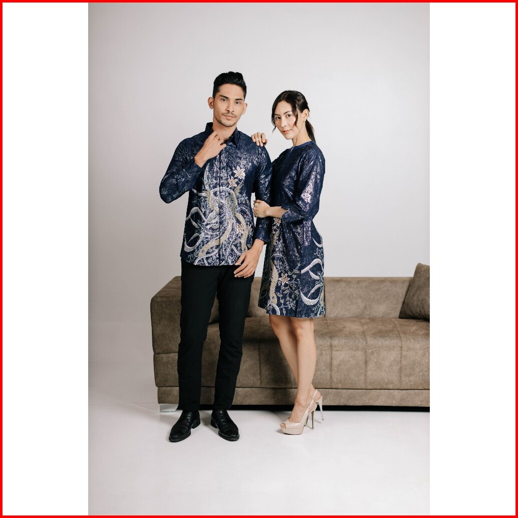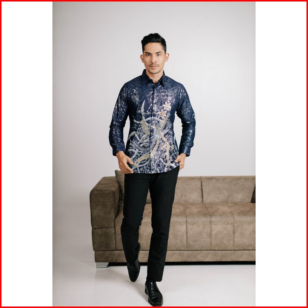 Adyatma Naratama Navy Blue Kemeja Batik Slim Fit Pria Lengan Panjang Katun Foil