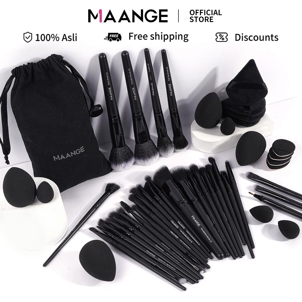 Maange Set Kuas Rias Profesional 30 Buah Dengan Kantong Penyimpanan + 16Pcs Spons Make Up Set Lembut Premium Mudah Dibaw