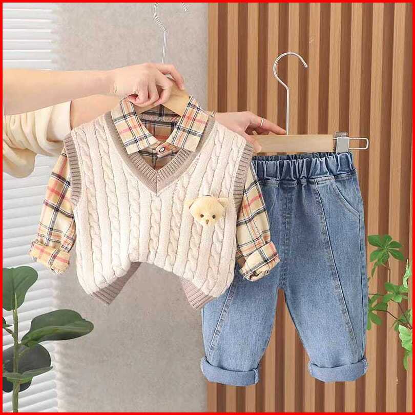 Kidsfo-4 Setelan 3in1 Set Anak Laki Rompi Rajut Kemeja Dan Celana Jeans Panjang
