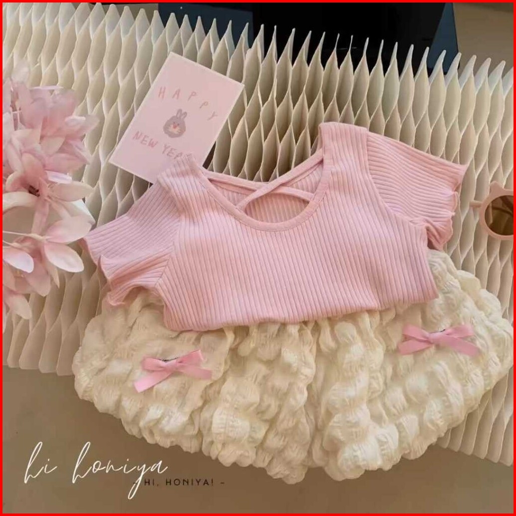 Kidsfo-107 Setelan Anak Perempuan One Set Korean Style Celana Pendek Balon Bubble Puffy