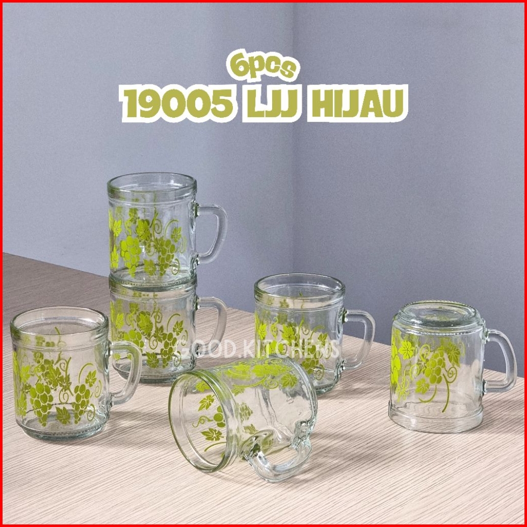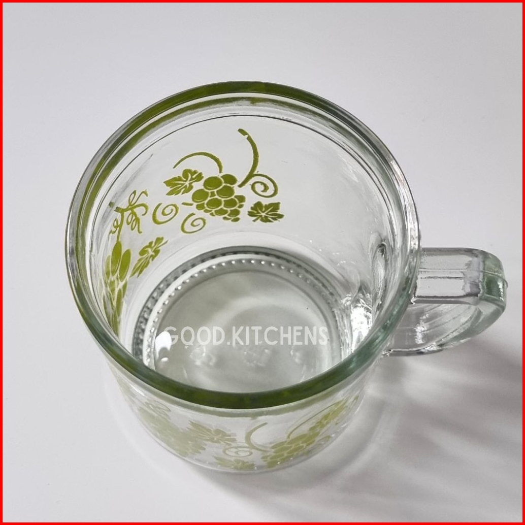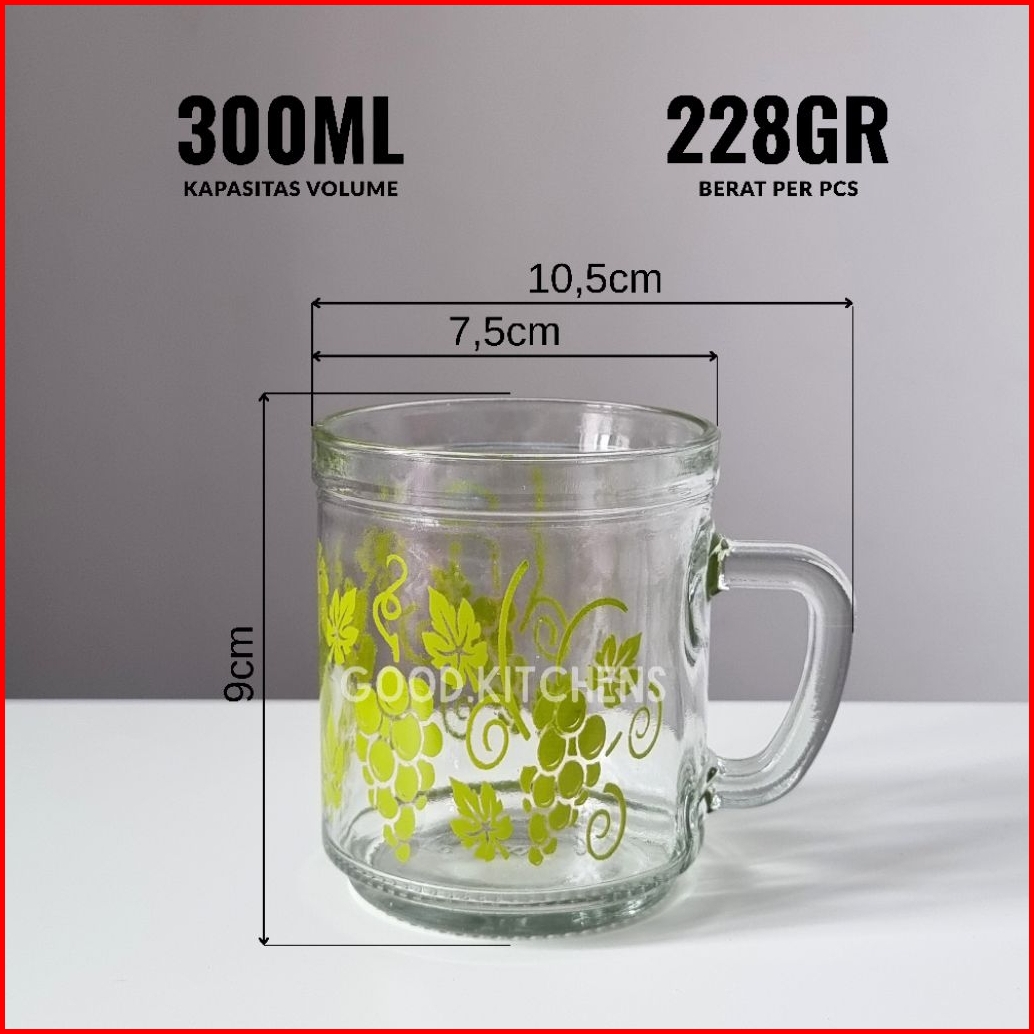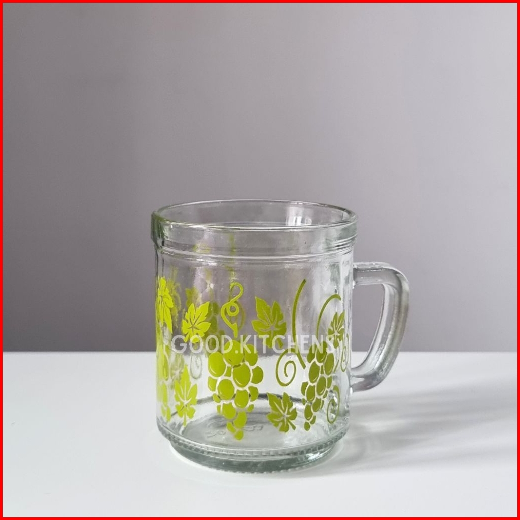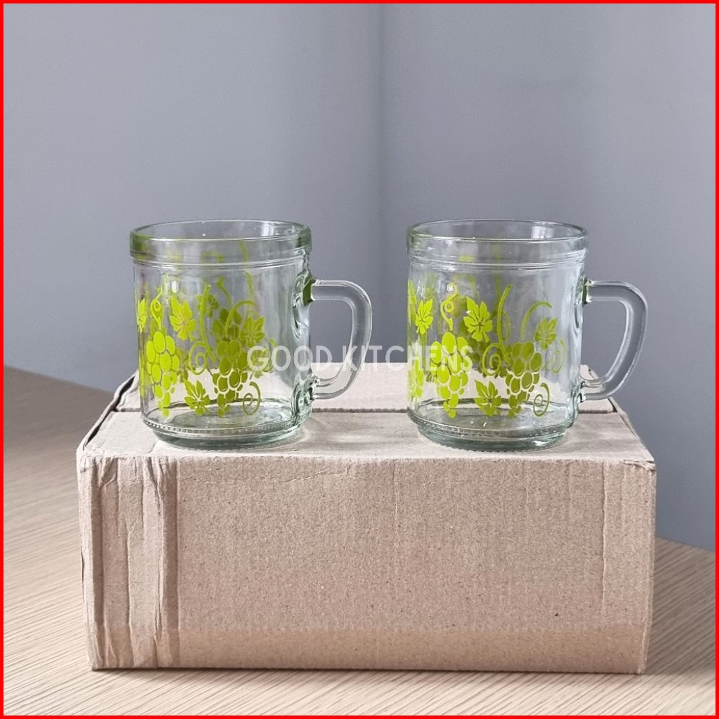 G373 6 Pcs Gelas Kopi Kaca Gelas Minum Gelas Gagang Gelas Murah Gelas Souvenir Gelas Warteg Motif Anggur Hijau