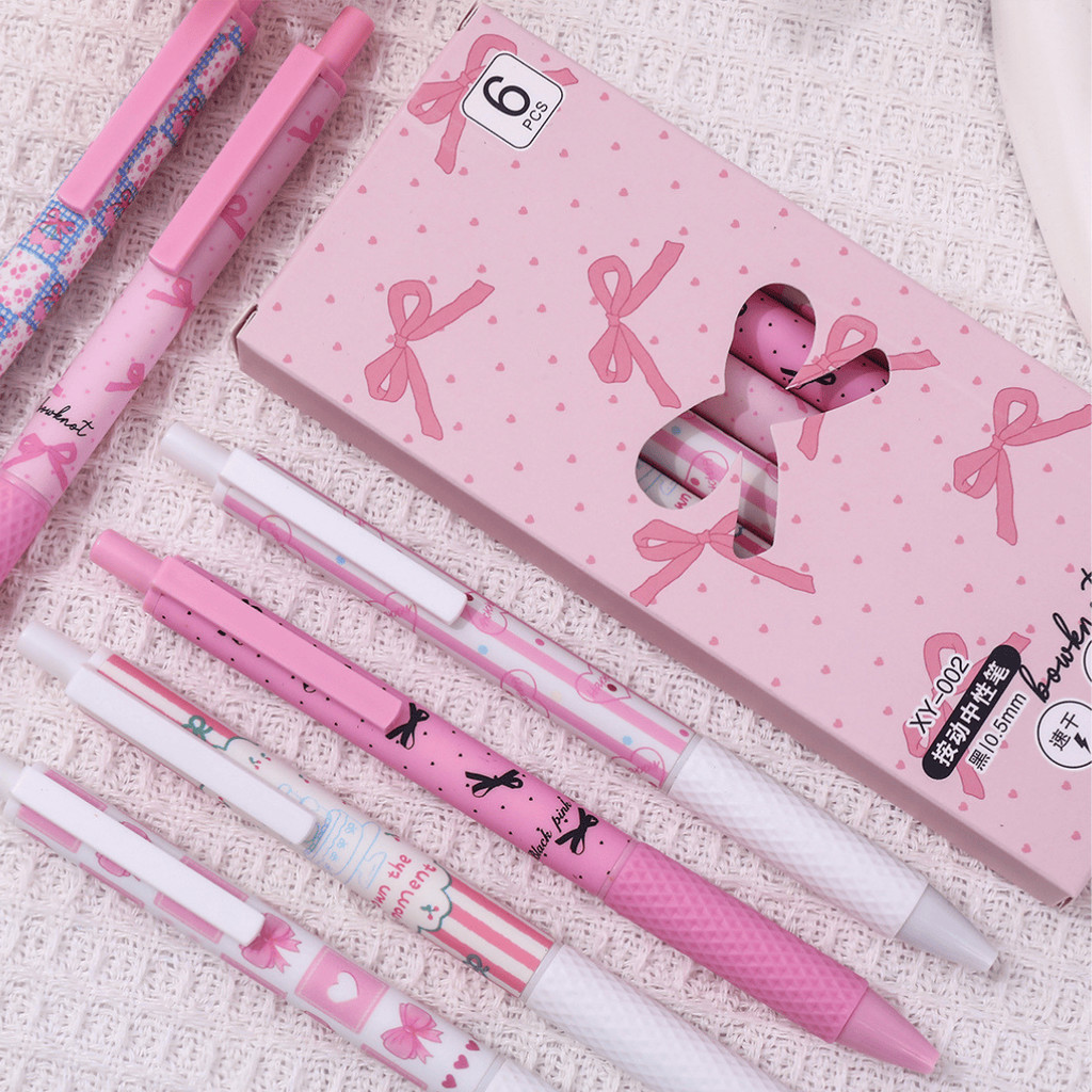 MOKA 1Set Isi 6 Pcs Pulpen Mekanik Aesthetic / Pink Stuff Stationery / Ribbon Pink Set Pen / Coqquete Mechanical Pen MKP