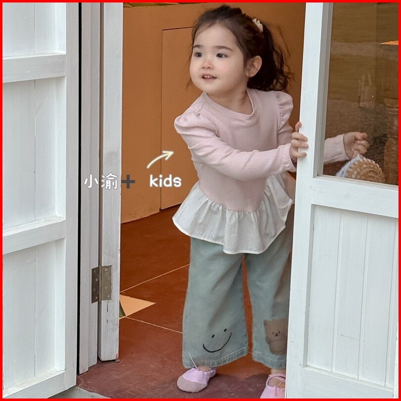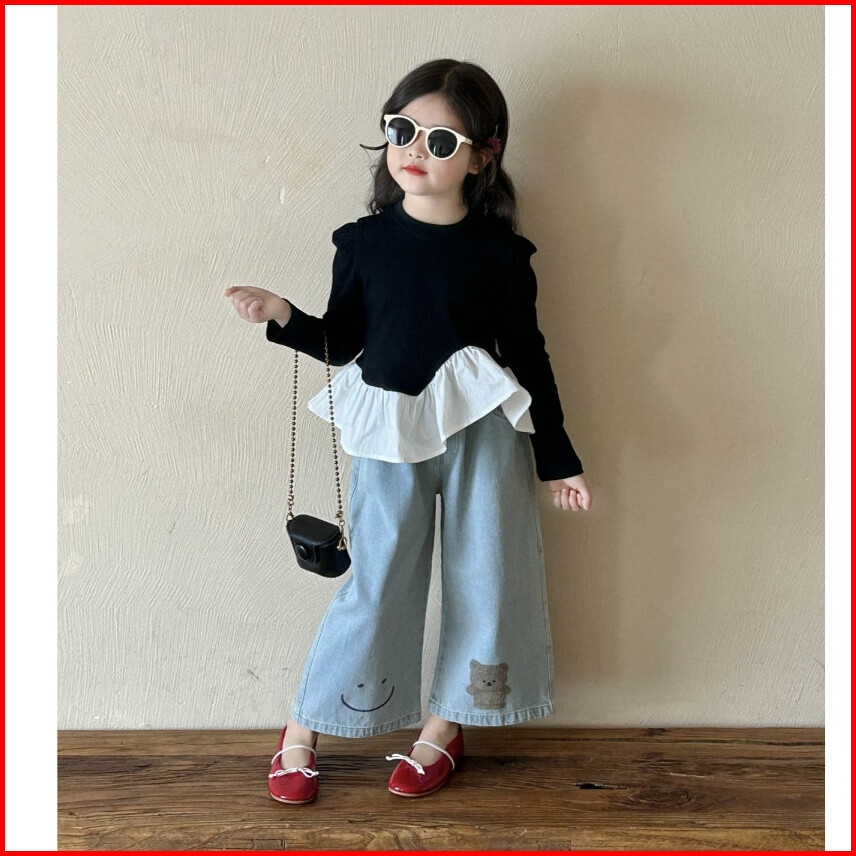 Kidsfo-21 Setelan One Set Anak Perempuan Kaos Hitam Lengan Panjang Celana Jeans Kulot