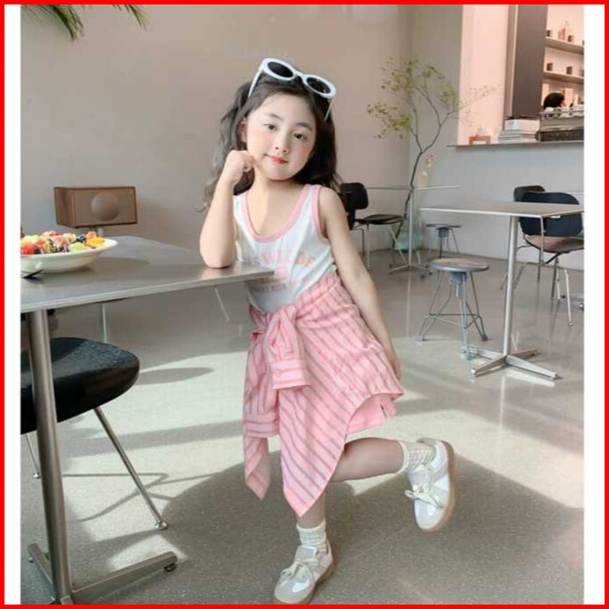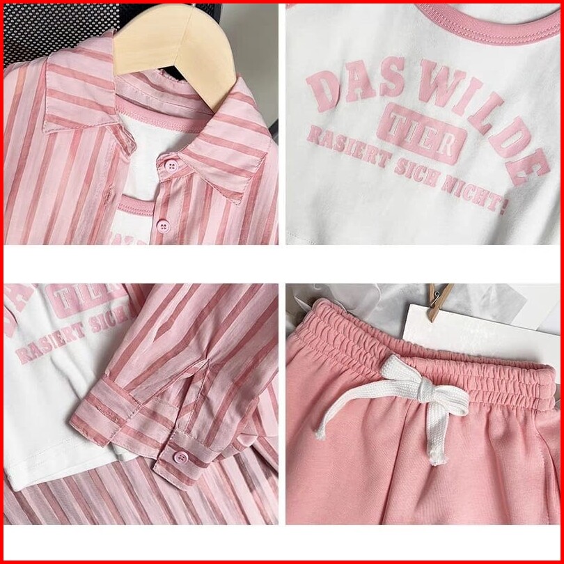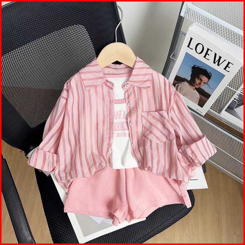 Kidsfo-61 Setelan Anak 3in1 Set Kaos Buntung Outer Kemeja Pink Garis Celana Katun Pendek
