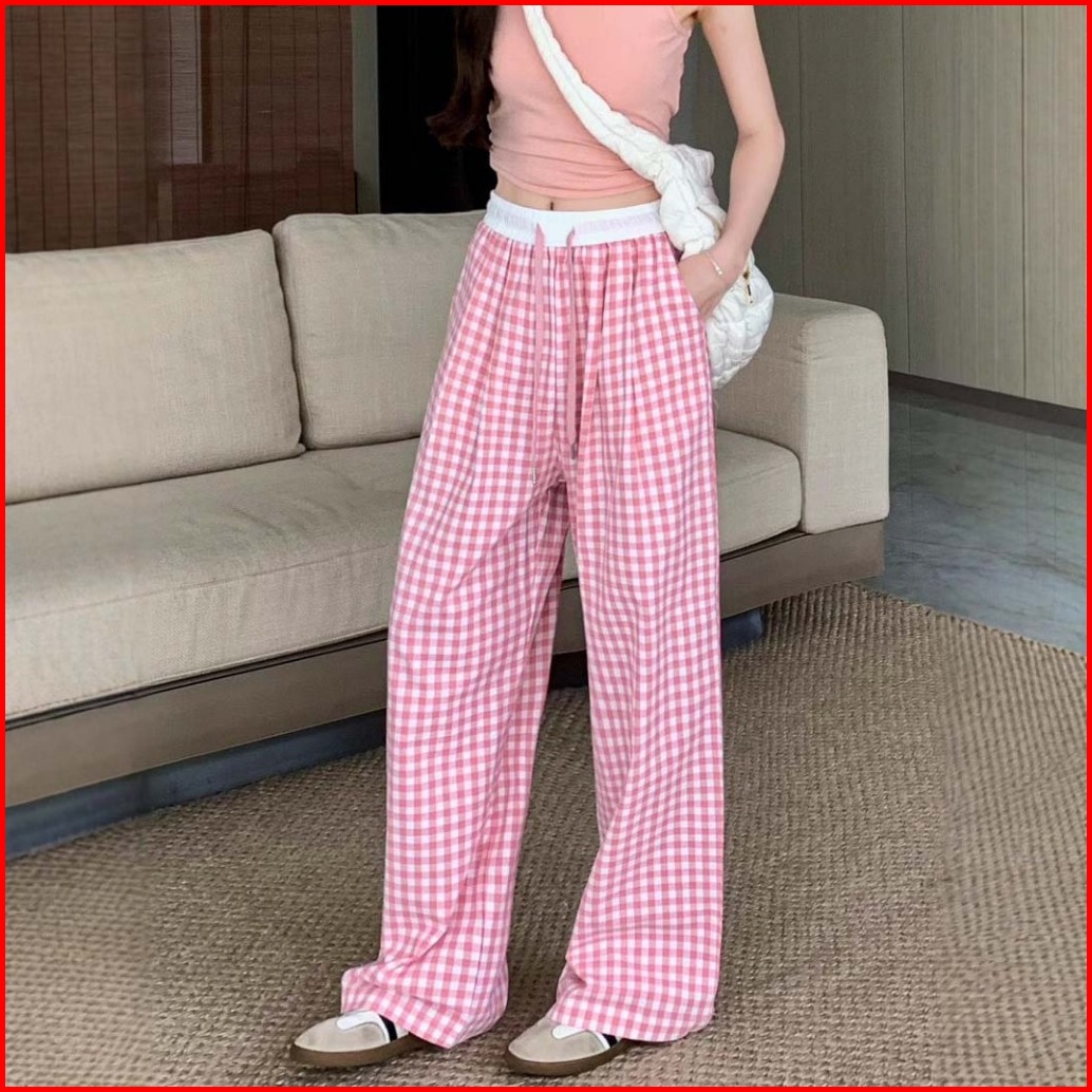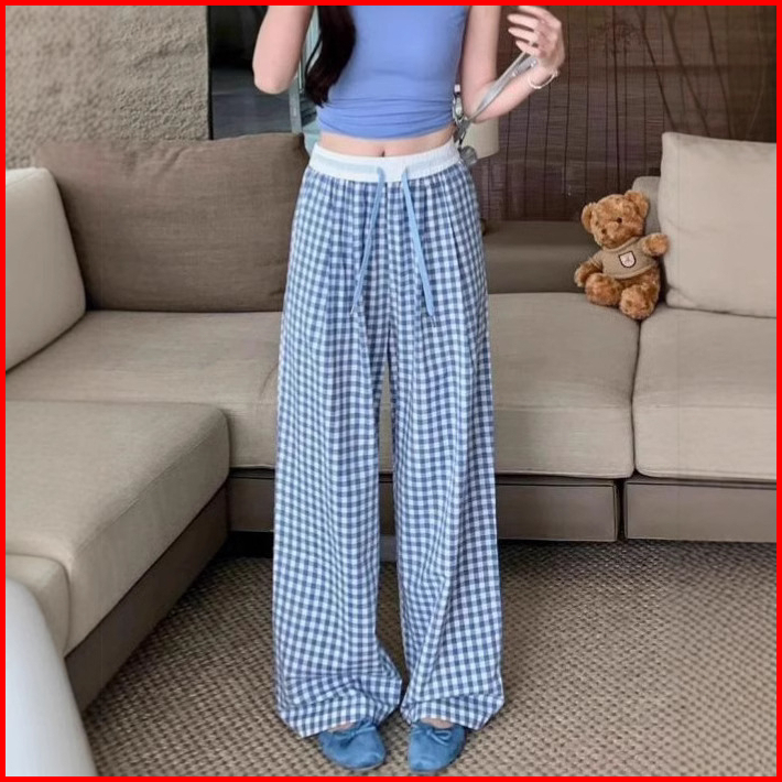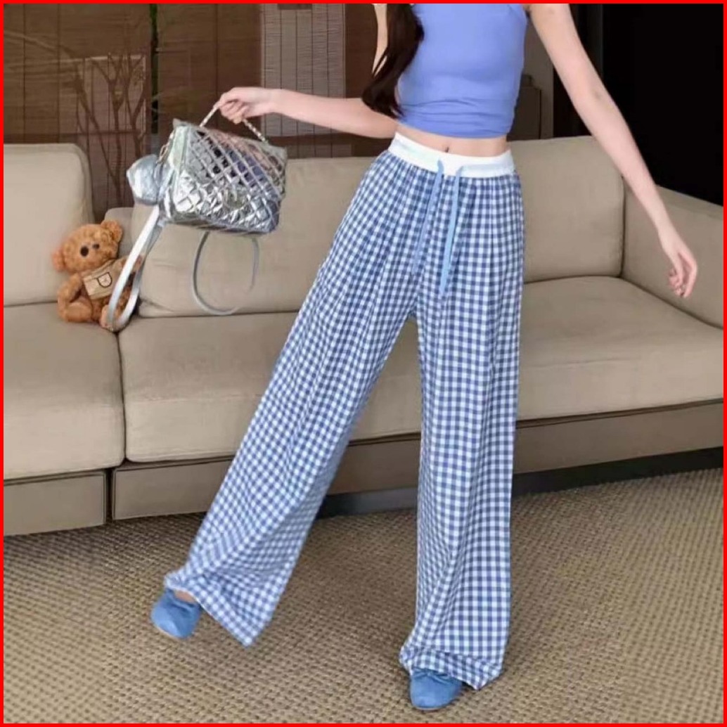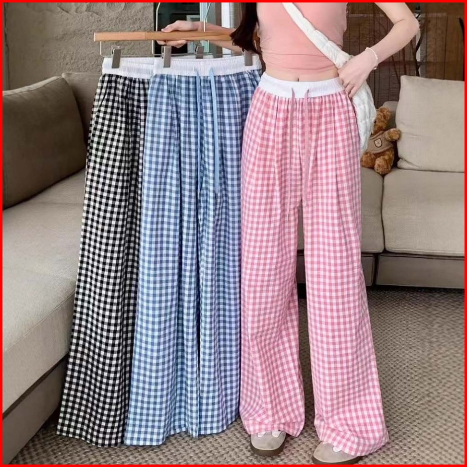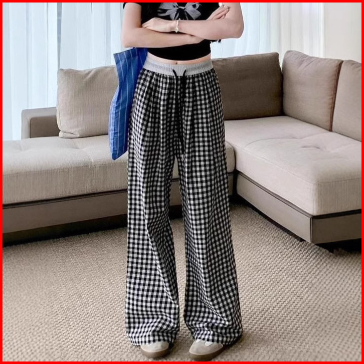 Gdtima Celana Kulot Wanita Kotak Highwaist Casual Loose Pants Celana Kulot Kotak Kotak