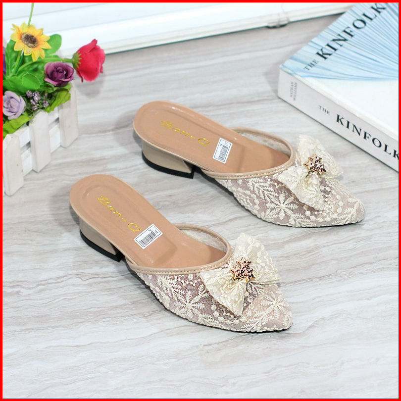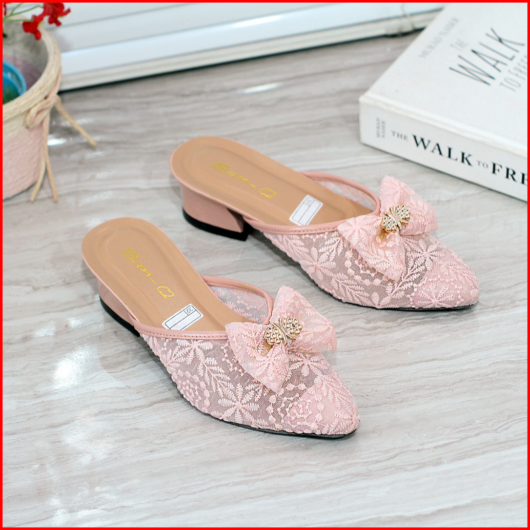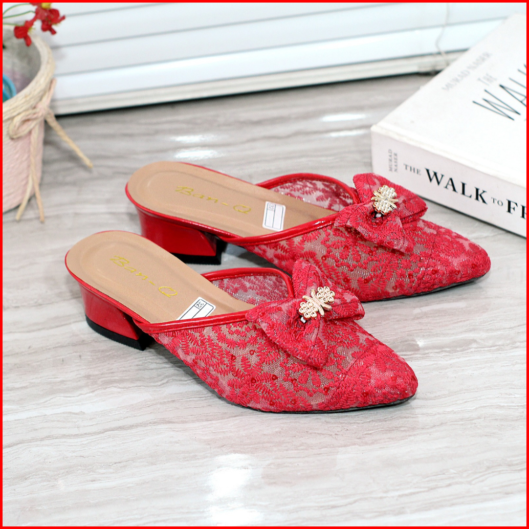Sepatu Sandal Pesta Anak Perempuan Brukat Hak Tahu 3 Cm Motif Pita Slip On Chunky Heels Selop Cewe Tahun Vynscollection