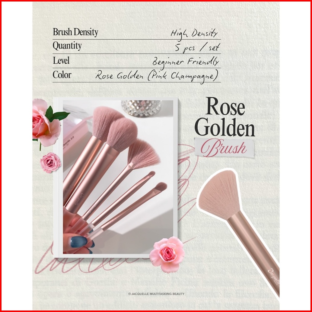 Jacquelle Rose Golden Brush Set Pouch - Set Kuas Makeup Travel Friendly - Ultra Soft Micro Crystal Fiber Vegan Cruelty F