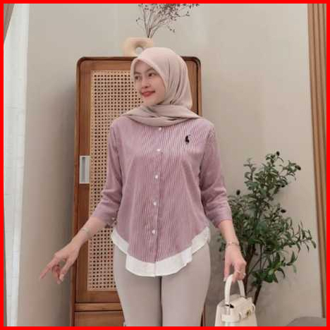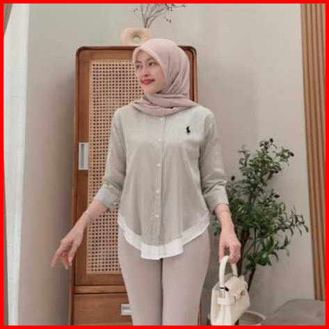 Kemeja Wanita Korean Look Rayon Twill Premium Bordir Logo Casual Lengan Panjang 7 8 Jumbo Ld120 Terbaru Kekinian 2025